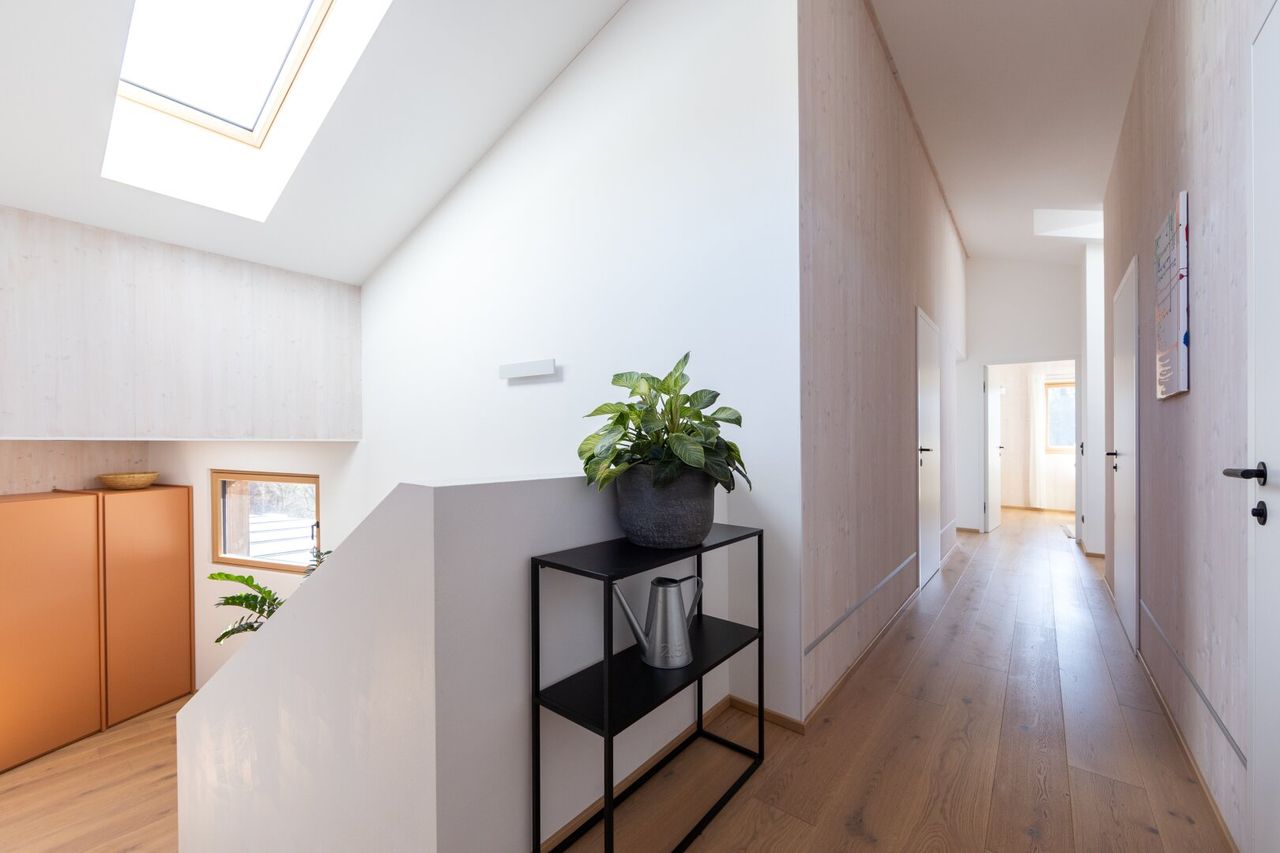 Die Kombination aus Ziegelmassivbau im Erdgeschoss und sichtbaren CLT-Massivholzwänden im Obergeschoss schafft ein außergewöhnlich angenehmes Raumklima.