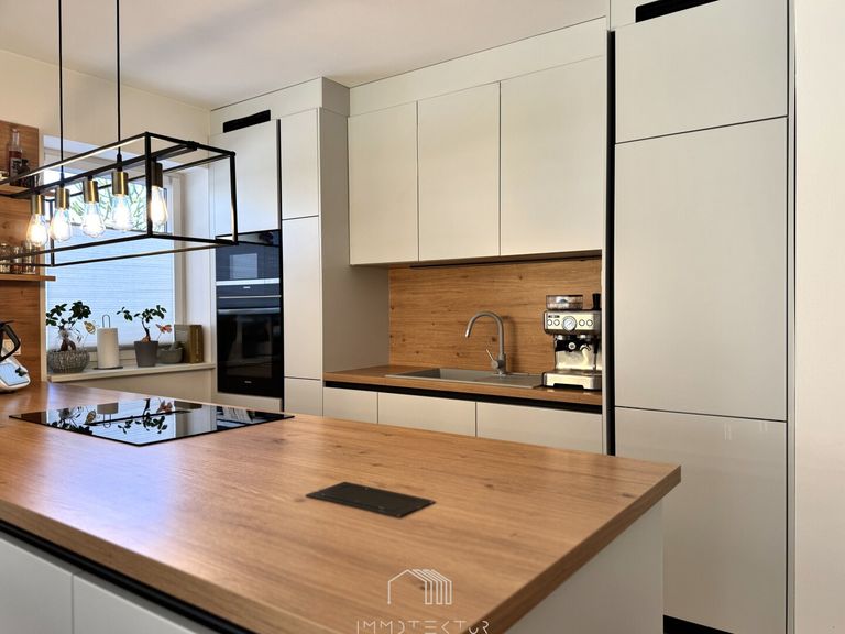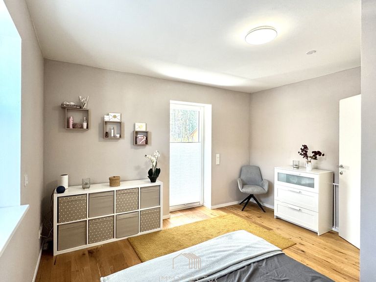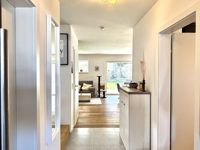 Dieses freistehende, nach Süden ausgerichtete Einfamilienhaus wurde 2021 in hochwertiger Massivbauweise (50er Ziegel!) fertiggestellt und erstmals bezogen. Schon beim Blick auf den Grundriss merkt man: Hier wurde mit Köpfchen geplant und mit Weitblick gestaltet.