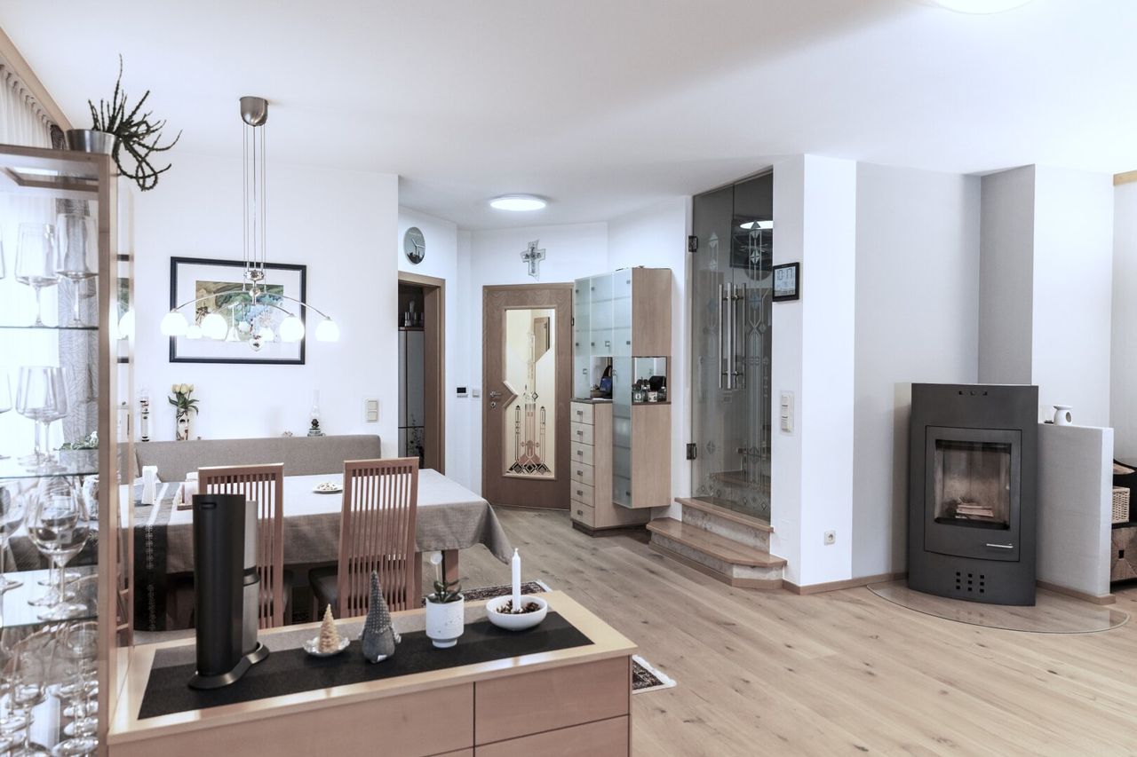 - großzügiger Wohn- Essbereich mit einem Schwedenofen und direktem Gartenzugang