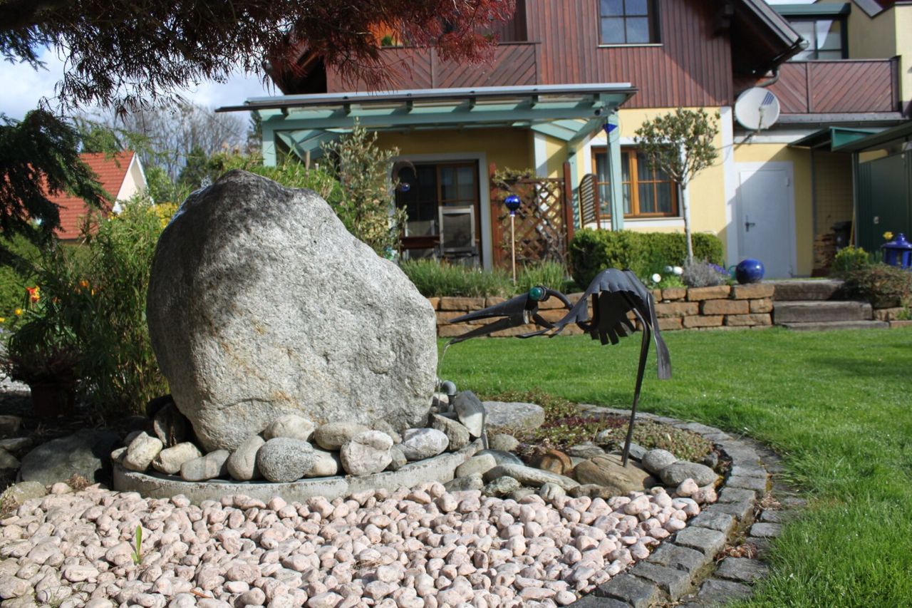 Liebevoll gestaltete Gartenbepflanzung, Sickerschacht für Gartenbewässerung