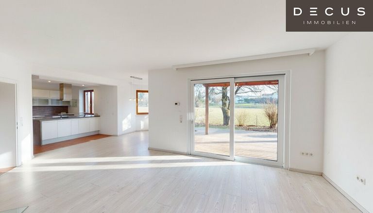 Der lichtdurchflutete Wohnbereich öffnet sich Richtung Garten und Terrasse und profitiert von der optimalen südseitigen Ausrichtung. Der freie Blick...