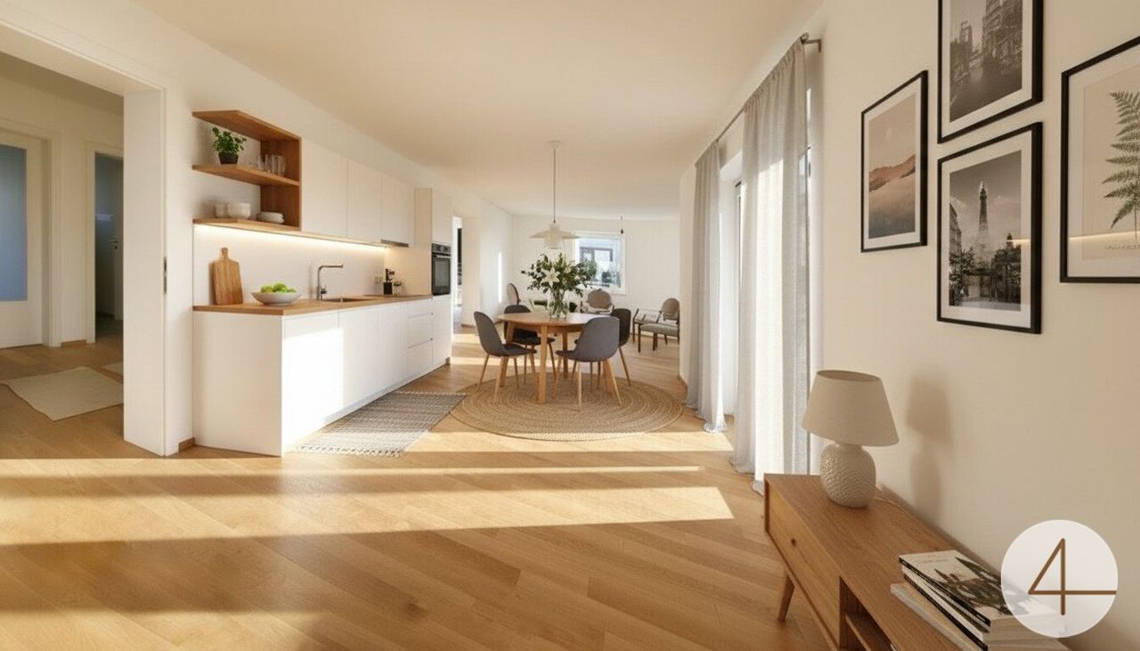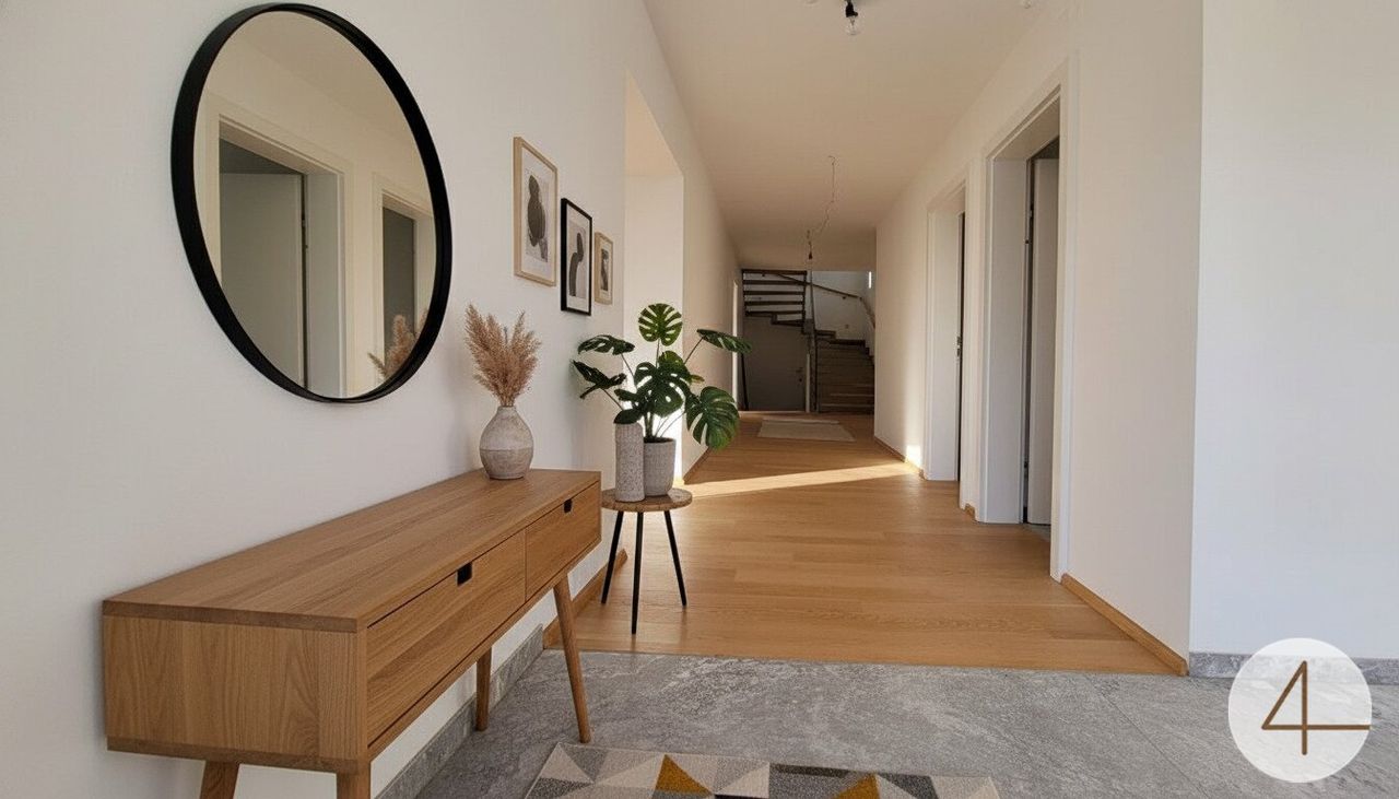 Einladendes Vorzimmer mit elegantem Garderobenbereich, weiter Flur, offener Wohn-Ess-Küchenbereich mit Zugang zur großzügigen 92 m² Terrasse.