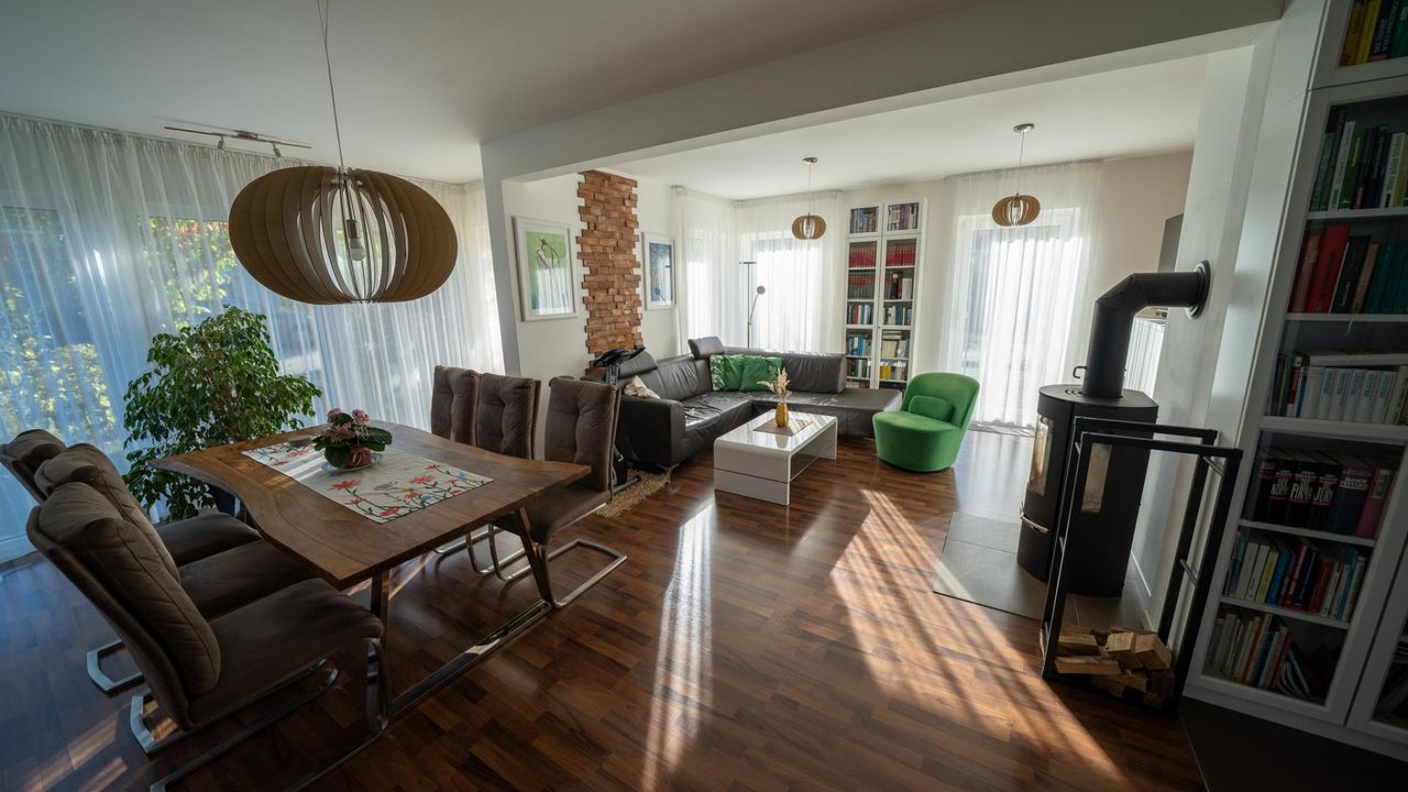 die vor allem durch die lichtdurchfluteten Räume,und die wohlige Wärme des Kaminofens zum Tragen kommt.