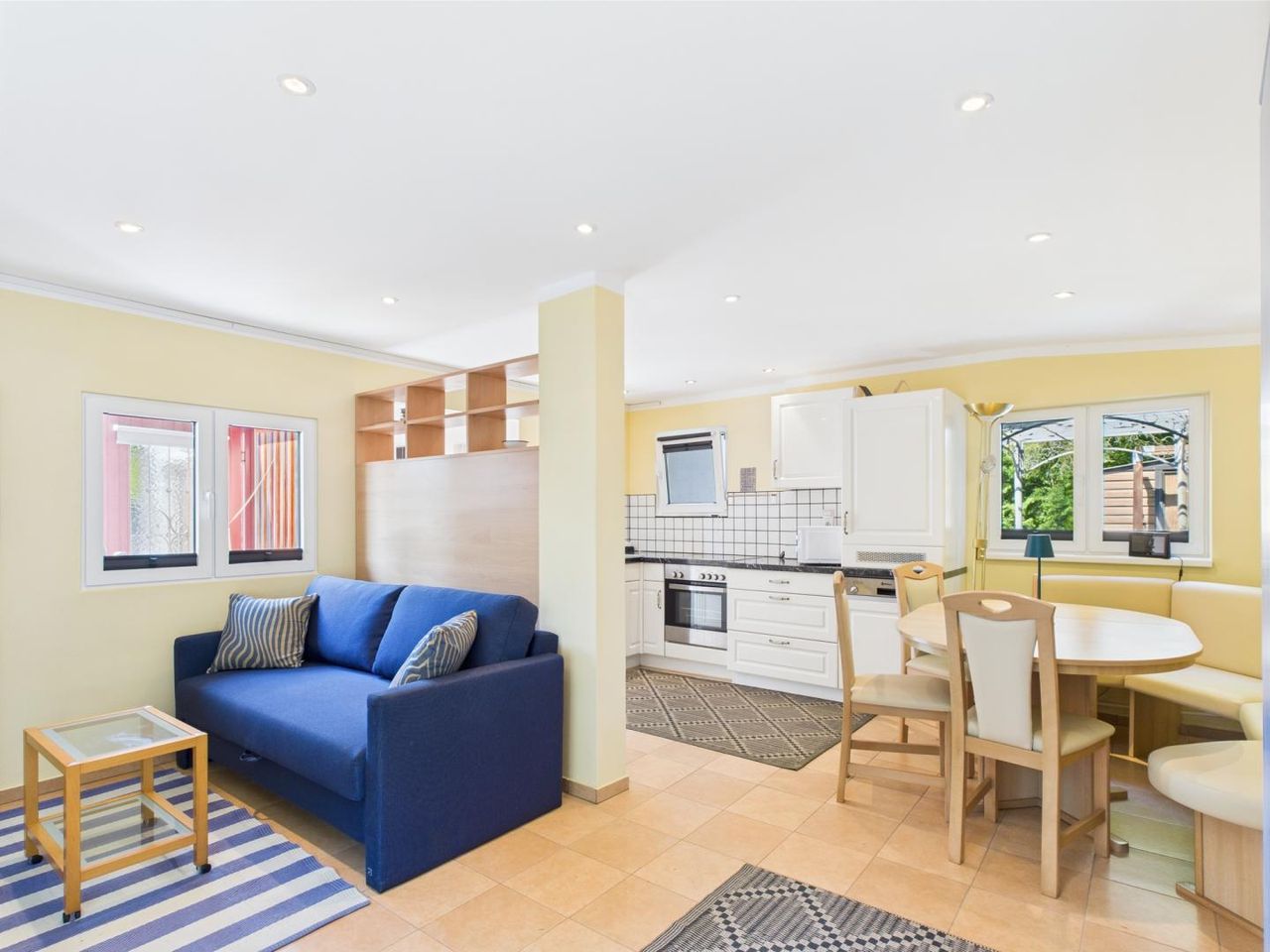 + teils abgetrennter Wohnbereich mit ausziehbarer Couch (160 cm breit) und Matratzentopper für erholsame Nächte