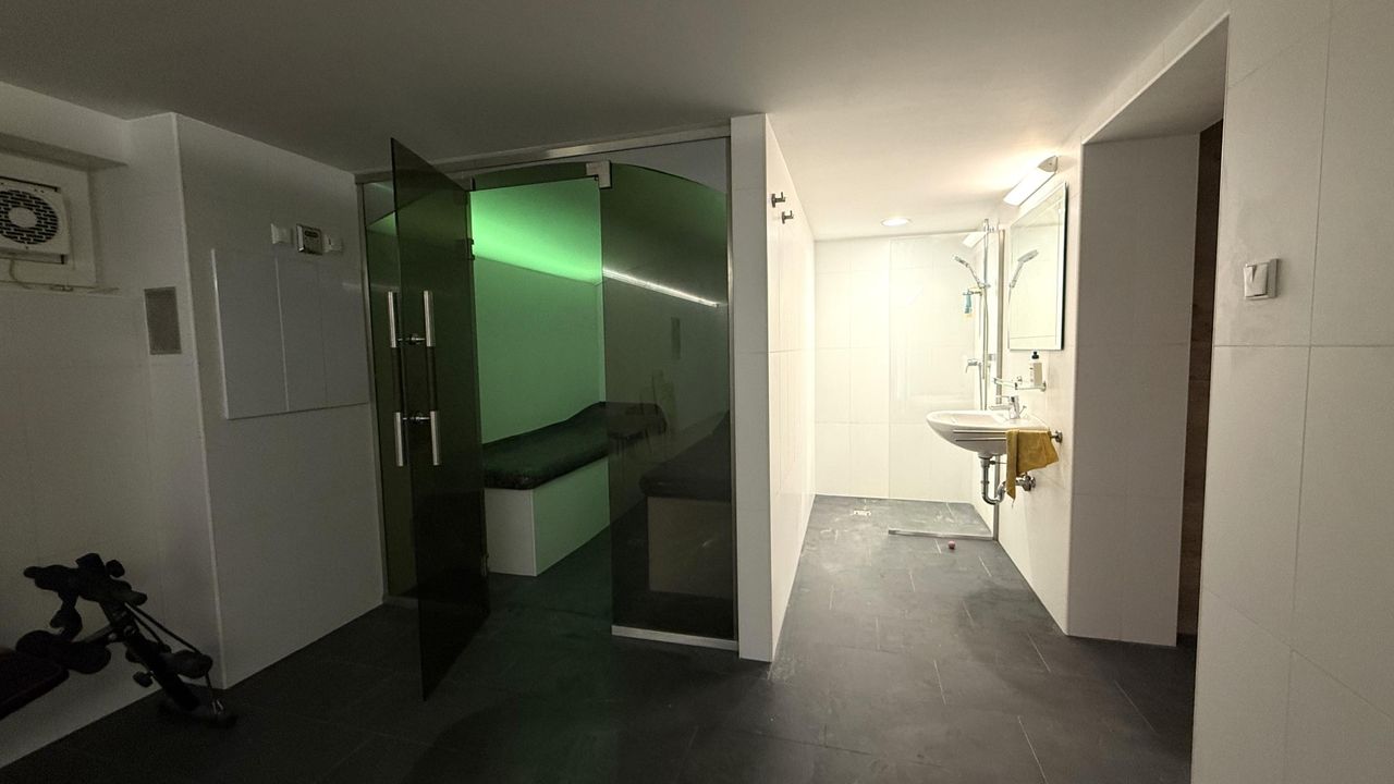 • Wellnessbereich mit Dusche – Sauna, Dampfbad (mit Mosaik-Liegen beheizbar, Lichtwechsler