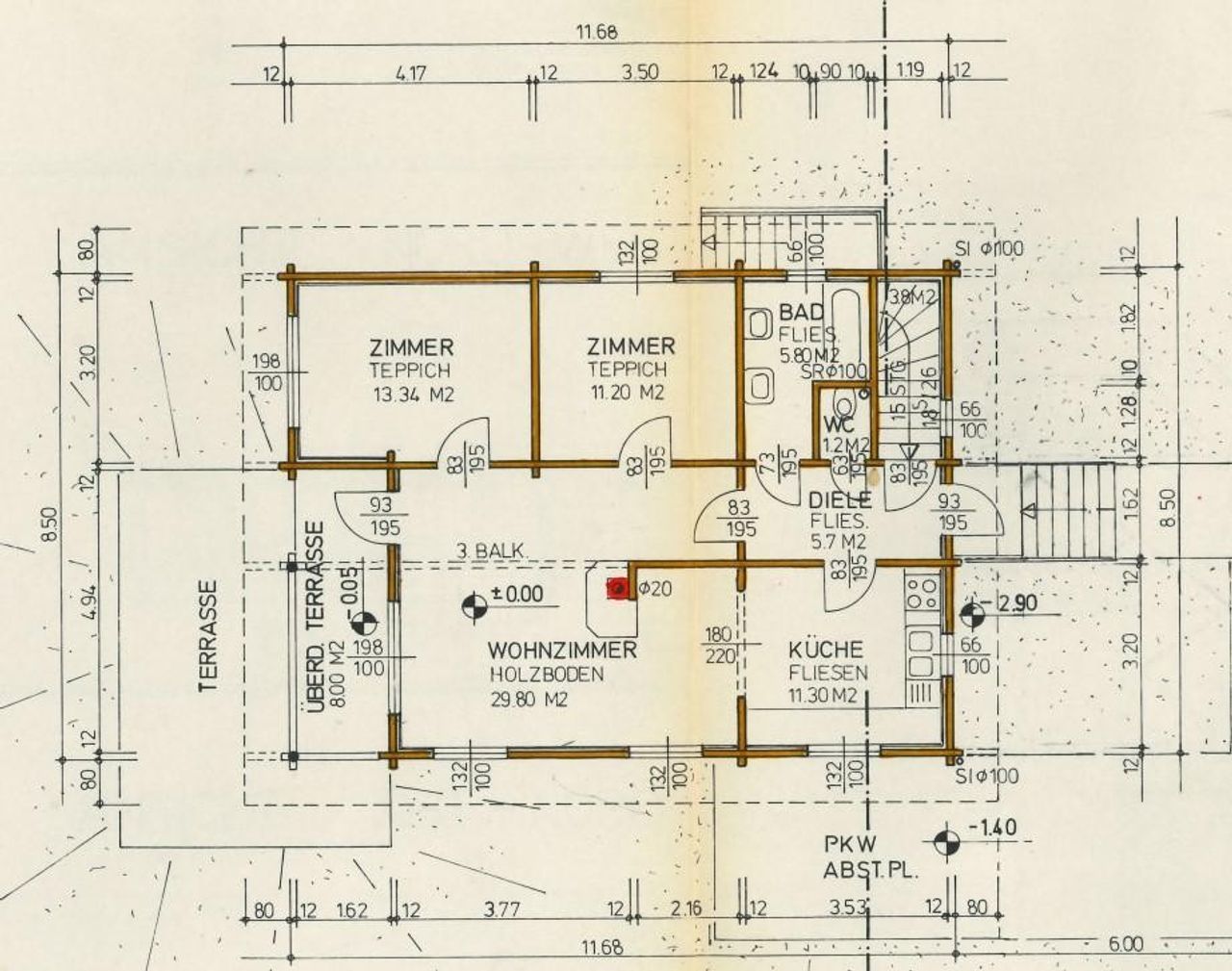 Das 1991 von Schultes Blockhaus fertig gestellte Holzblockhaus (12cm dicke finnische Hochlandkiefer zzgl. 5cm Wärmedämmung) verfügt über ca. 175 m² Wohn - und Nutzfläche, davon ca. 82 m² Wohnfläche im Erdgeschoss sowie ca. 25 m² Wohnfläche im Keller. Ein Highlight der Immobilie ist sicher die 20 m² große Terrasse die vom Wohnzimmer aus begehbar ist und über einen Abgang zum Garten verfügt, zudem sind ca. 10 m² der Terrasse überdacht.
