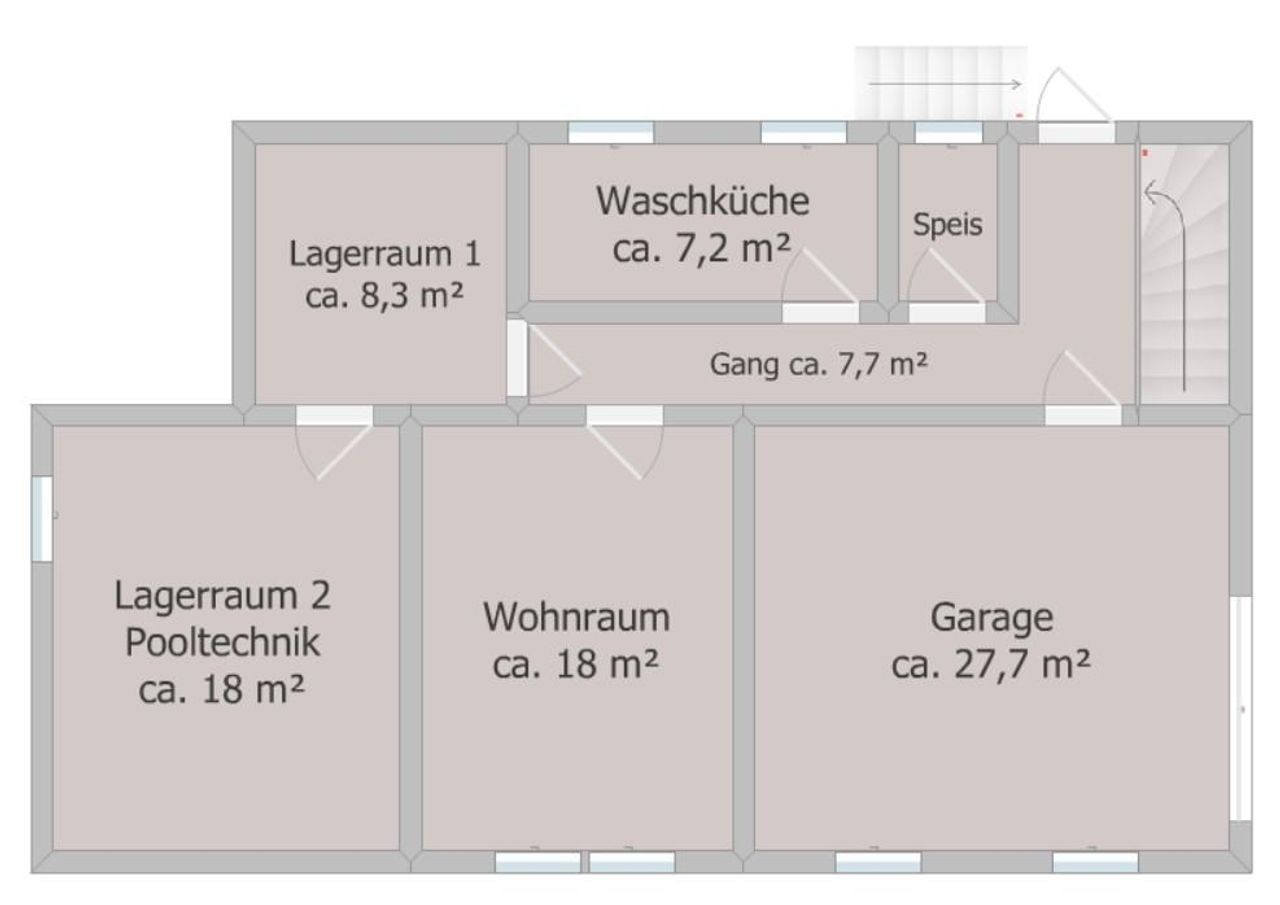 Das Erdgeschoss ist aufgeteilt in einen Vorraum, einen ca. 29 m² großen Wohnbereich, eine Küche, zwei Schlafzimmer sowie ein Badezimmer mit Dusche, WC und Bidet. Den Keller können Sie sowohl über einen Stiegenabgang im Haus wie auch von außerhalb des Hauses erreichen. Dieser bietet neben einem als Schlafzimmer genutzten Zimmer von ca. 18 m² eine Speisekammer, einen Hauswirtschaftsraum sowie 2 Lagerräume. Besonders erwähnenswert ist die 28 m² große Garage mit elektrischem Einfahrtstor sowie einer Grube. Die Räume im Keller sind alle mit Heizkörpern ausgestattet.