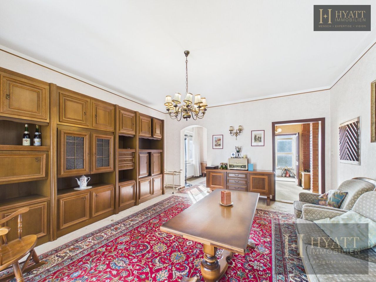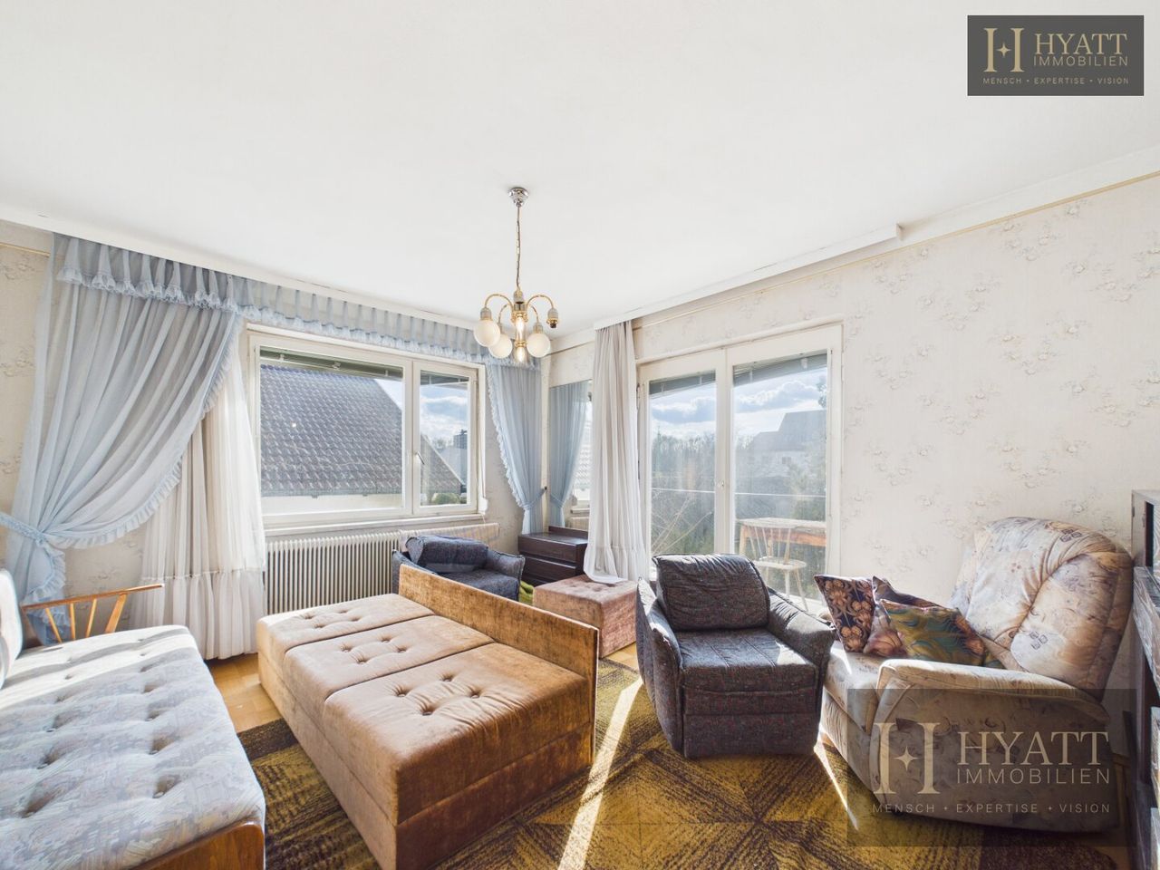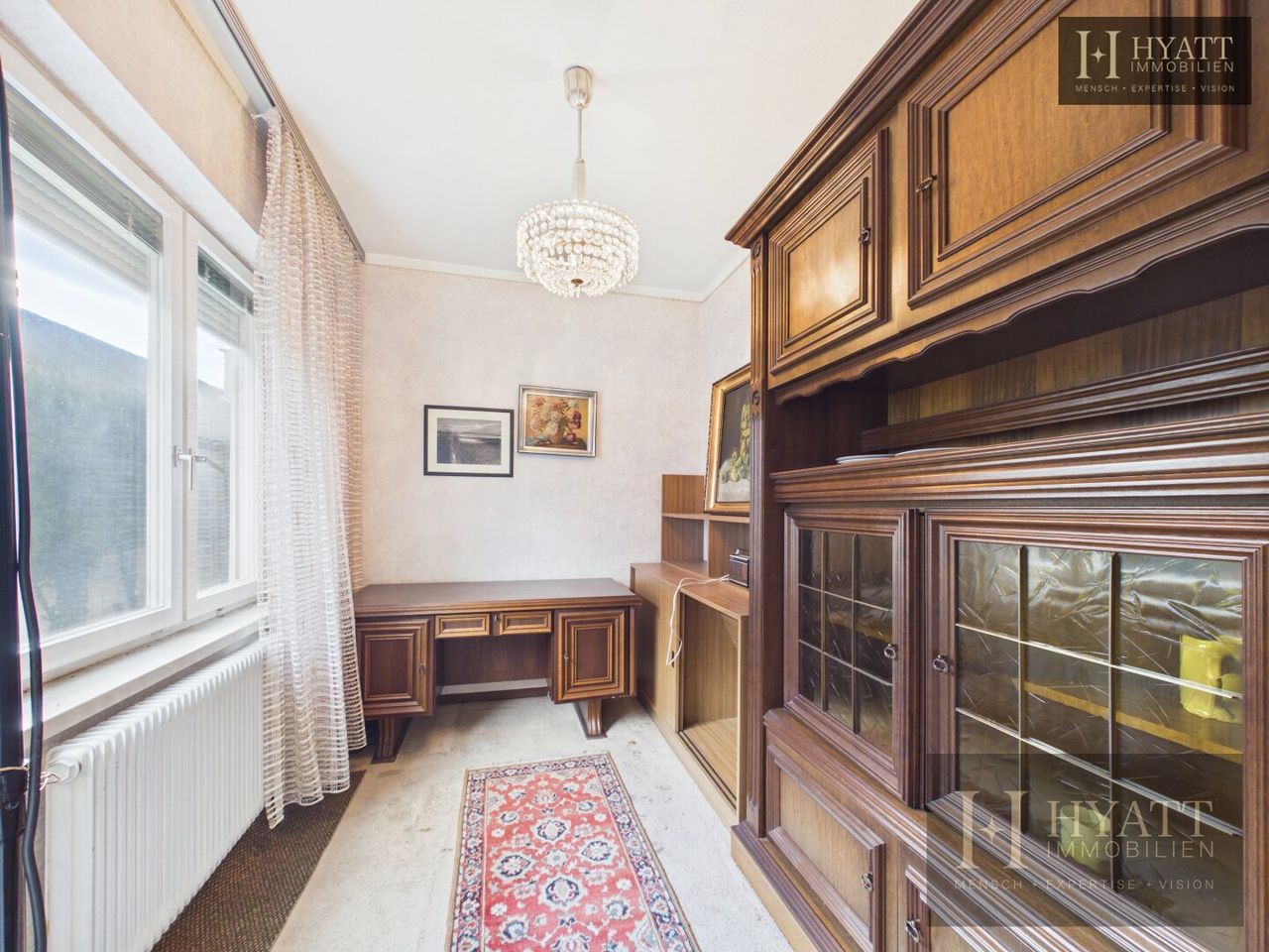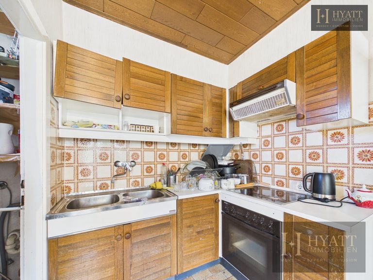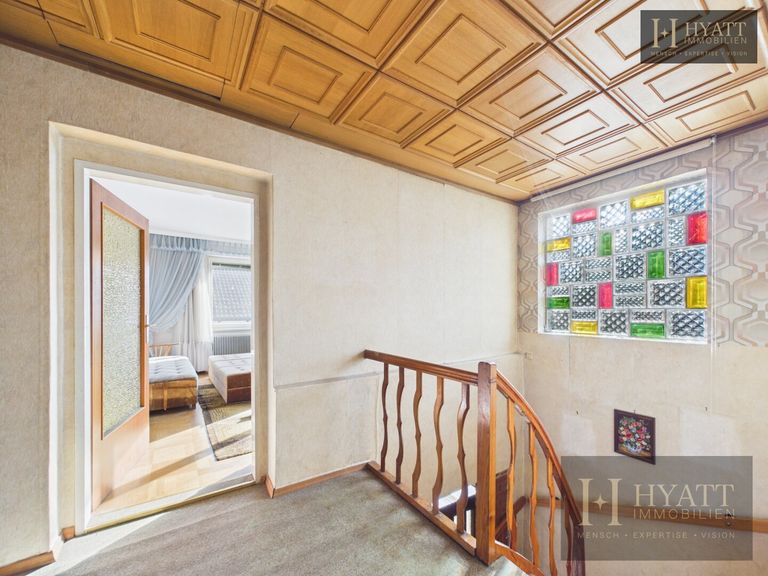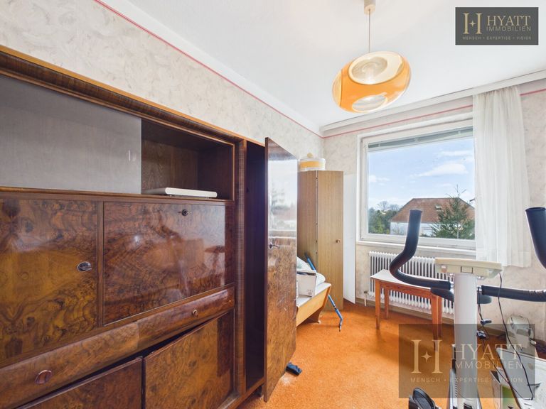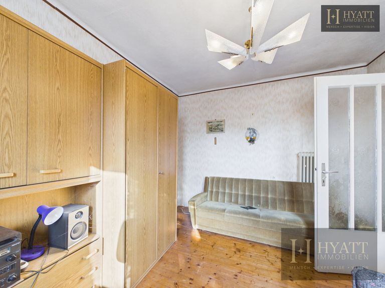 Die Innenräume sind grundsätzlich gut erhalten und bewohnbar, während im Außenbereich – insbesondere an der Fassade – Modernisierungsmaßnahmen sinnvoll sein können, um das Haus optisch und energetisch auf den heutigen Stand zu bringen.
