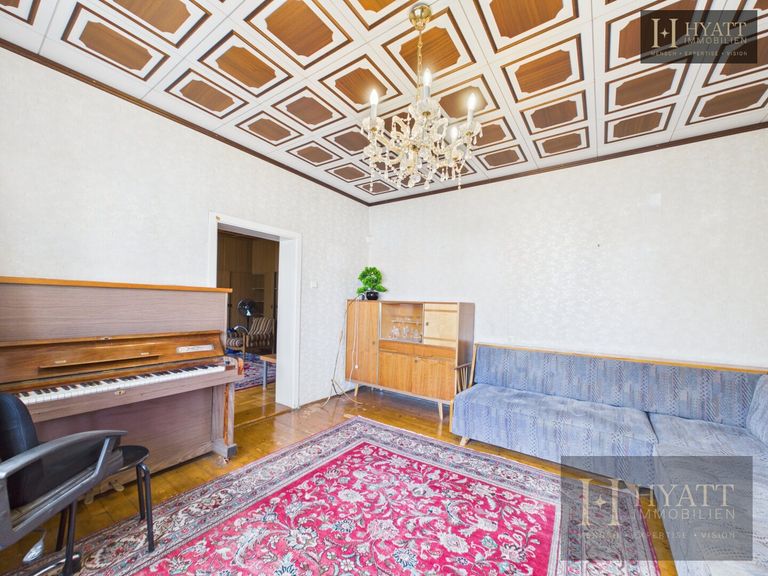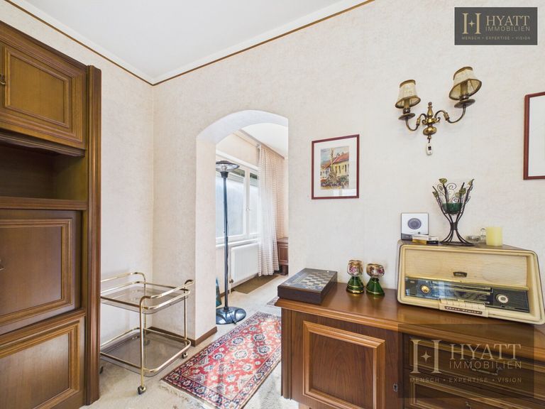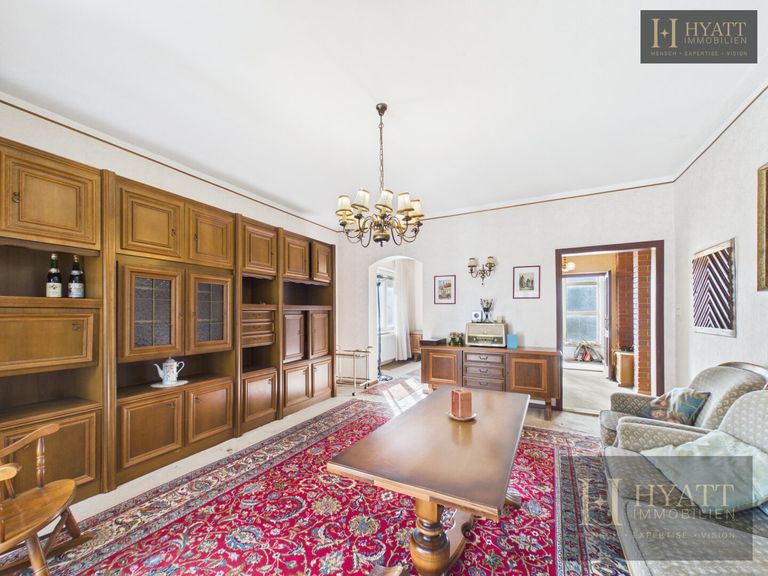 Im Inneren verfügt das Haus über klassische Ausstattungsdetails wie Parkettböden, großzügige Fensterflächen sowie dekorative Holz- und Deckenelemente, die den Räumen einen besonderen Charakter verleihen. Der helle Wohnbereich bietet Zugang zu einem verglasten Wintergarten, der zusätzlichen Wohnraum schafft und einen angenehmen Übergang zum Garten bildet.