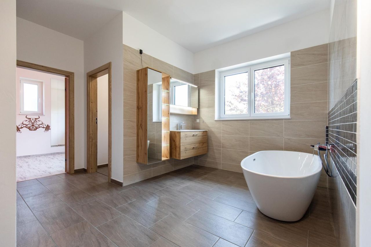 + Hochwertige Sanitäranlagen, freistehende Badewanne, bodentiefe Dusche