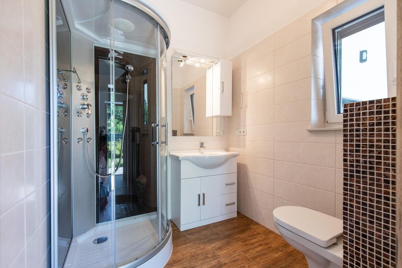 Zwei moderne Badezimmer, drei WCs und eine exklusive Vollholztreppe in Tischlerqualität unterstreichen den stilvollen Charakter des Hauses.