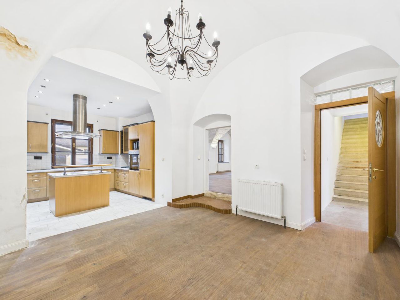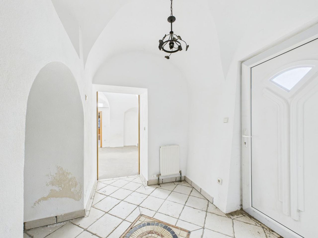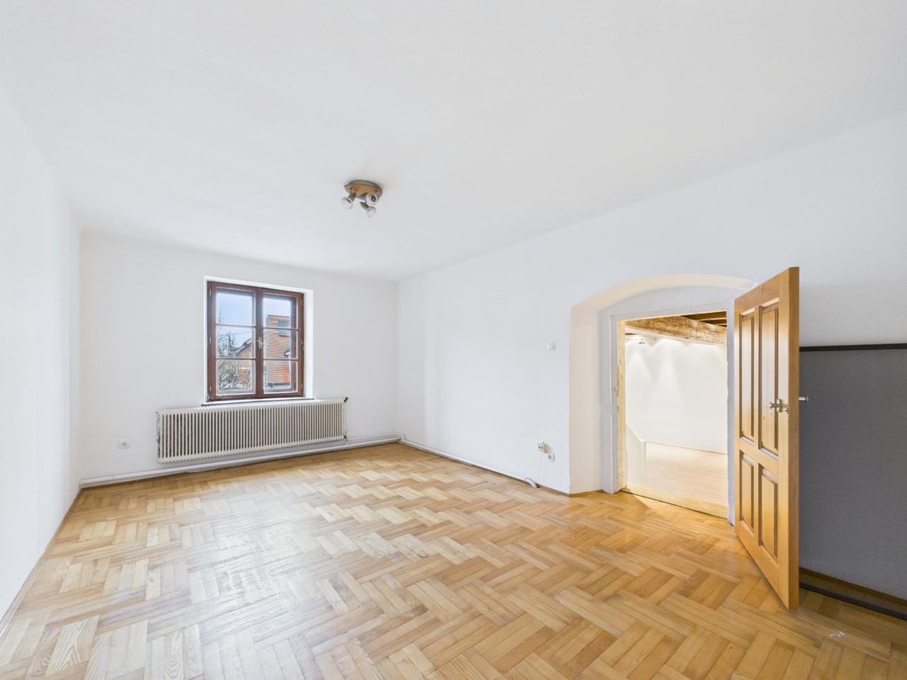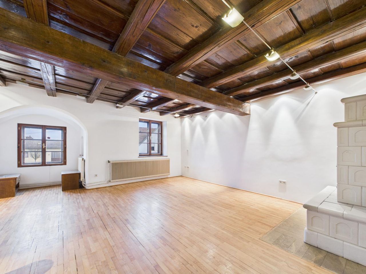 Das Wohnhaus verfügt über eine gewachsene Bausubstanz mit teilweise erhaltenen historischen Bauelementen. Im Wohnzimmer befindet sich ein Kachelofen, der dem Raum ein klassisches Erscheinungsbild verleiht und der ursprünglichen Nutzung des Hauses entspricht. Die Substanz des Gebäudes bietet eine Grundlage für eine Sanierung oder Weiterentwicklung unter Berücksichtigung denkmalrechtlicher Vorgaben.