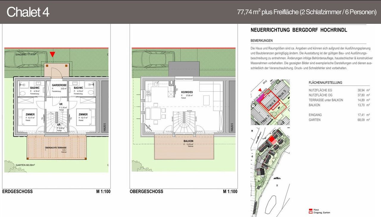 Es werden 14 gemütlichen Chalets errichtet, mit herrlichem Blick über das Kärntner Land, mitten im traumhaften Ski – und Sommergebiet. Diese Chalets vereinen den urigen Charme der Alpen mit modernen Komfort und sind eine perfekte Investitionsmöglichkeit KÄRNTEN / BERGDORF HOCHRINDL Entdecken Sie Ihre neue Freizeitimmobilie in der malerischen Region Hochrindl, im wunderschönen Kärnten! Diese charmante Ferienimmobilie bietet Ihnen die ideale Gelegenheit, Ihre Träume von Ihrem eigenen Chalet und Kapitalanlage zu verwirklichen. Es werden 14 gemütlichen Chalets errichtet, mit herrlichem Blick über das Kärntner Land, mitten im traumhaften Ski – und Sommergebiet. Diese Chalets vereinen den urigen Charme der Alpen mit modernen Komfort und sind eine perfekte Investitionsmöglichkeit für Naturliebhaber und Anleger. Mit Huetten.com haben wir den Spezialisten für die Vermarktung der Chalets. CHALET 4: Wohnfläche: 77,74 m² Das Chalet 4 verfügt im Erdgeschoss über 2 Schlafzimmer. Jedes Schlafzimmer hat seinen eigenen privaten Sanitärbereich. Die Sanitärbereiche werden mit hochwertigen Feinsteinzeug ausgestattet. Im Obergeschoss befindet sich der 37,80 m² lichtdurchflutete Wohn-Essbereich mit dem 13,70 m² Balkon und herrlichen Blick über das Kärntner Land. 1 Kfz Stellplatz im Freien ist inkludiert. Weitere Grundrisse finden Sie im beiliegenden Expose. Attraktive Ausstattung: Hochwertige Materialien und gemütliches Ambiente. Auf Wunsch voll ausgestattet. DIE CHALETS Die Wohnflächen bewegen sich zwischen 76m² - 122m². Jedes Chalet verfügt über einen Balkone, Terrasse und Gartenanteil. 1 KFZ-Stellplatz im Freien ist inkludiert. Stellplätze im Carport können zusätzlich erworben werden. Die modernen Chalets erstrecken sich auf 2 Ebenen und umfassen zwischen 2 und 4 Schlafzimmer. Abhängig vom jeweiligen Chalet befindet sich auf einer Ebene der Wohn-Essbereich und auf der anderen Ebenen die Schlafbereiche. Fast jedes Schlafzimmer verfügt über einen eigenen Sanitärbereich (Bad mit Dusche, Waschbecken und WC). Die Chalets bieten Platz für 4 bis 8 Personen mit jeweils 2-3 Schlafzimmer und einer Ausziehcouch (Wohnzimmer). VERMARKTUNG Seit über 35 Jahren vermietet HUETTEN.COM in Deutschland, Österreich, Schweiz und Italien. Von der einfachen Berghütte auf der Alm bis hin zum luxuriösen Chalet direkt auf der Skipiste, bietet das Portfolio von huetten.com jedem Urlauber das passenden Angebot. Huetten.com war der erste Reiseveranstalter in Europa, welcher sich auf den Bereich von Almhütten und Chalets spezialisiert hat. Mit huetten.com als Partner an Ihrer Seite, kann auch Ihr Chalet zu einem lukrativen Nebenverdienst werden. www.huetten.com Freizeit auf der Hochrindl Die Lage dieser Immobilie ist einfach unschlagbar. Hochrindl, bekannt für seine beeindruckende Natur und die Vielzahl an Freizeitmöglichkeiten, ist der perfekte Ort, um dem Alltag zu entfliehen. Die Umgebung bietet Ihnen und Ihren Gästen nicht nur Ruhe und Erholung, sondern auch zahlreiche Aktivitäten, sei es im Sommer beim Wandern und Radfahren oder im Winter beim Skifahren und Snowboarden. Die Hochrindl ist malerisch umrahmt von den Kärntner Nockbergen. Die Hochrindl (1617 m) ist ein Alpenpass sowie ein Alm- und Skigebiet in den Nockbergen in Kärnten zwischen Ebene Reichenau und Sirnitz. Das zahlreiche Angebot finden Sie hier: https://www.hochrindl.at Lage / Anfahrt Die Anfahrt erfolgt meist über die B93 (Gurktal Straße), mit einem Abzweiger zur Hochrindl-Landesstraße (L65), die direkt ins Almgebiet führt. Mit dem Auto Vereinbaren Sie noch heute einen Besichtigungstermin und lassen Sie sich von der einzigartigen Atmosphäre dieser Freizeitimmobilie verzaubern. Wir freuen uns auf Ihre Anfrage und stehen für Besichtigungen vor Ort jederzeit gerne zur Verfügung. Hinweis gemäß Energieausweisvorlagegesetz: Ein Energieausweis wurde vom Eigentümer bzw. Verkäufer, nach unserer Aufklärung über die generell geltende Vorlagepflicht, sowie Aufforderung zu seiner Erstellung noch nicht vorgelegt. Daher gilt zumindest eine dem Alter und der Art des Gebäudes entsprechende Gesamtenergieeffizienz als vereinbart. Wir übernehmen keinerlei Gewähr oder Haftung für die tatsächliche Energieeffizienz der angebotenen Immobilie. Infrastruktur / Entfernungen Kinder & Schulen
