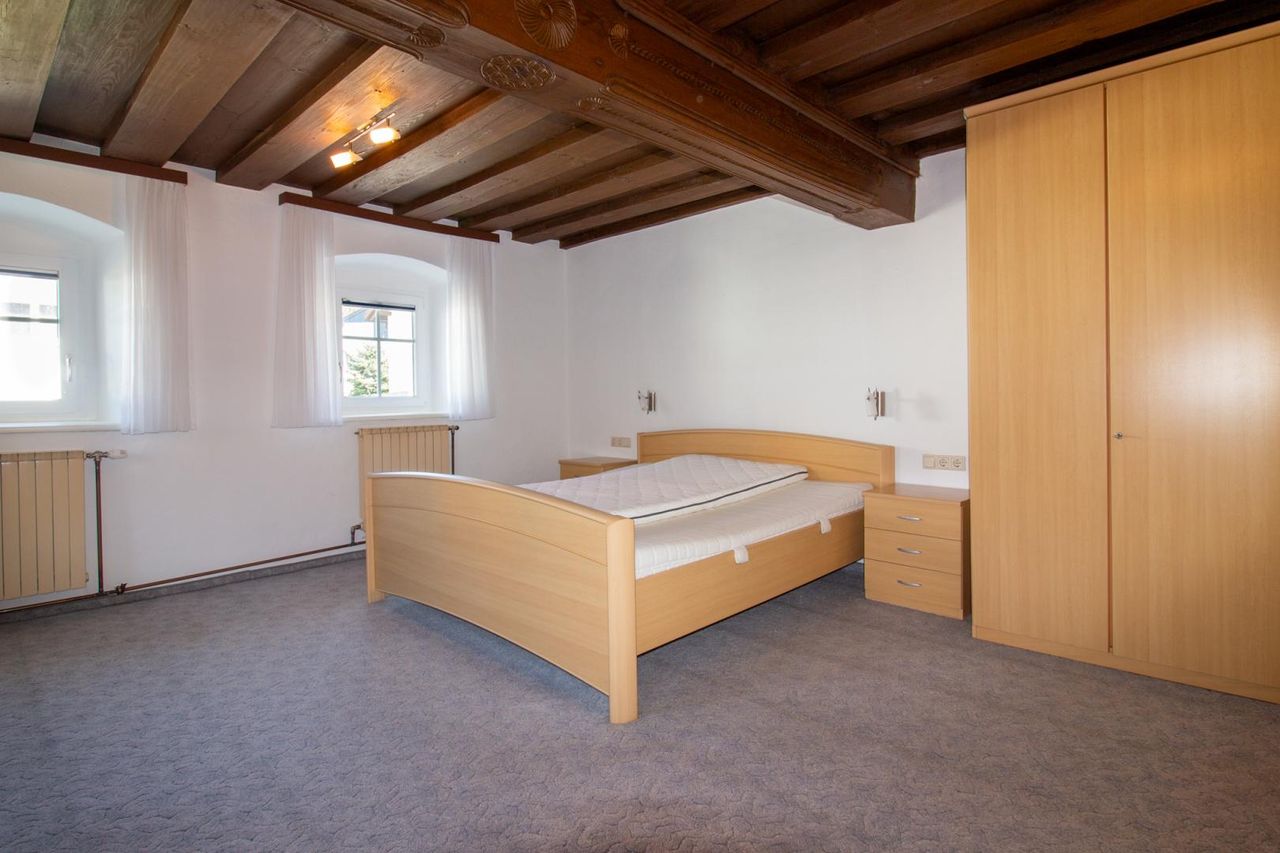 Das Erdgeschoss bietet eine klassische Raumaufteilung mit Küche, Wohnzimmer, Badezimmer, WC, Speisekammer, Einlagerraum sowie dem Heizraum. Im Obergeschoss befinden sich ein klimatisiertes Schlafzimmer und vier weitere Zimmer sowie ein kleines Badezimmer mit WC. Raumhöhen von 2,4 Metern, eine traditionelle Gewölbedecke im Vorhaus und in der Speisekammer sowie Holztramdecken im Wohn- und Schlafzimmer verleihen dem Haus besonderen Charme. Teilweise sind die Fenster mit Rollläden ausgestattet, ansonsten mit Plissees. Ein geschützter Innenhof mit großem Hoftor sowie ein liebevoll erhaltenes ehemaliges Stallgebäude unterstreichen den bäuerlich-historischen Charakter.