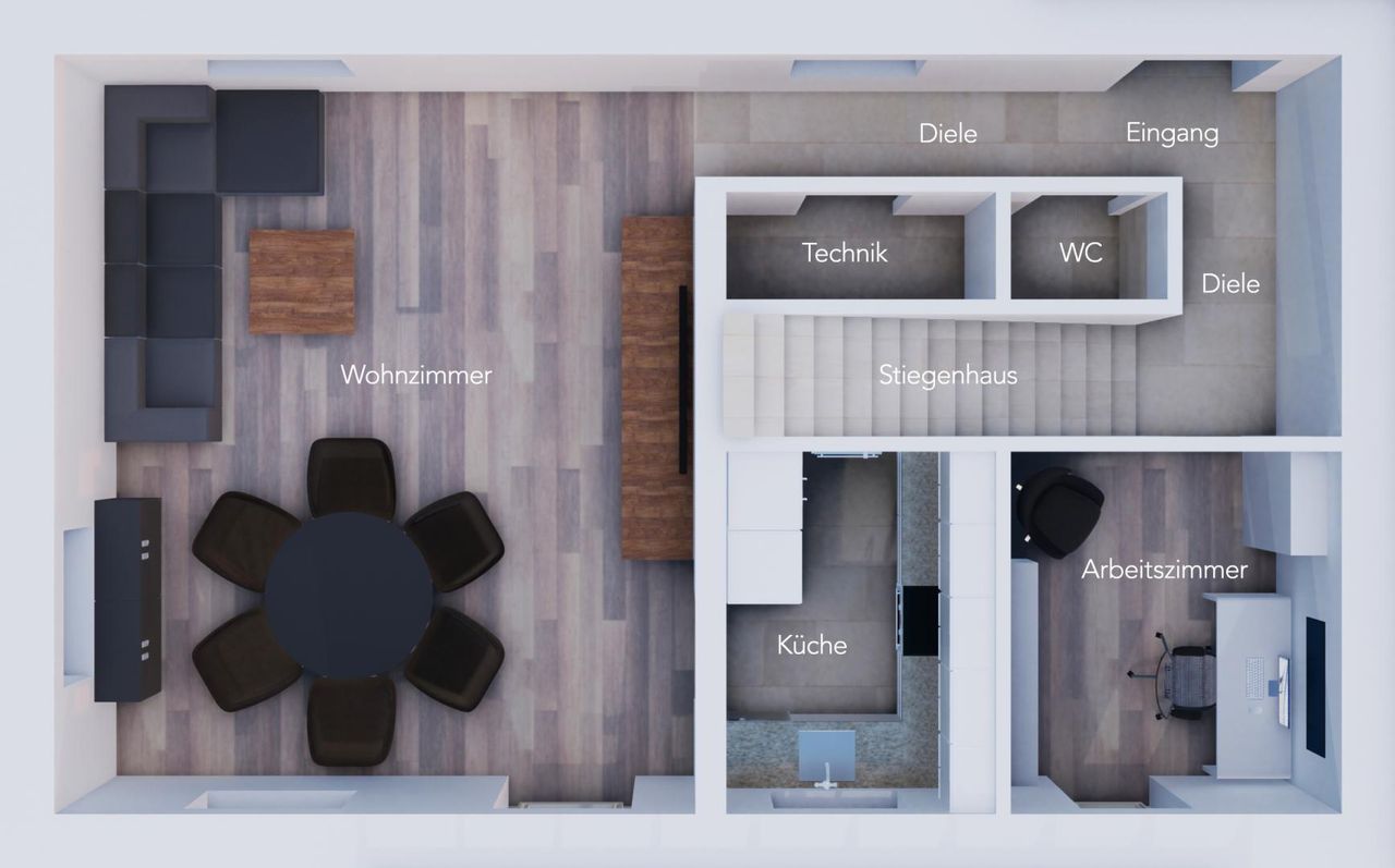 Das Erdgeschoss bildet das Herzstück des Hauses: Der großzügige Wohn- und Essbereich mit integrierter Kochnische schafft eine offene und einladende Atmosphäre für gemeinsame Stunden mit Familie und Freunden. Große Fensterflächen sorgen für viel Tageslicht und ermöglichen einen direkten Blick in den liebevoll gestalteten Garten. Ergänzt wird diese Ebene durch ein flexibel nutzbares Büro- oder Hobbyzimmer, ein separates WC sowie einen Technikraum.