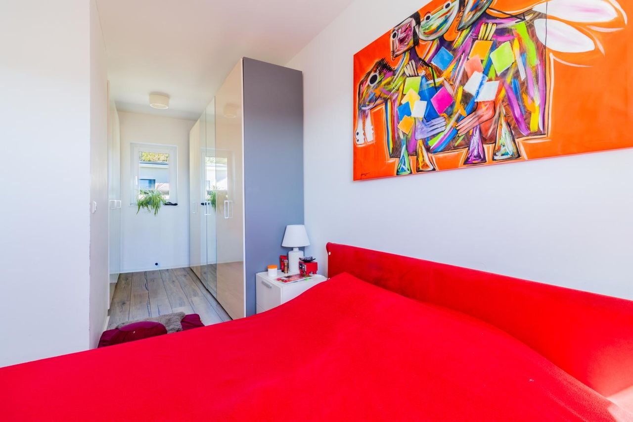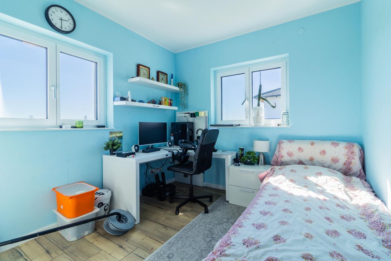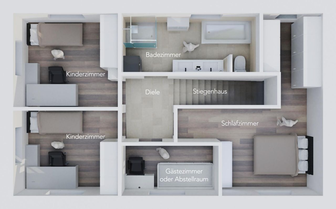 Im Obergeschoss setzt sich das durchdachte Raumkonzept fort. Das Elternschlafzimmer verfügt über eine praktische Nische für einen Kleiderschrank und bietet somit eine angenehme Rückzugsmöglichkeit. Zwei weitere Zimmer eignen sich ideal als Kinderzimmer, Gästezimmer oder zusätzliche Arbeitsräume. Das modern ausgestattete Badezimmer überzeugt mit einer gelungenen Kombination aus Badewanne, Dusche und WC und bietet ausreichend Platz für den Familienalltag. Ein weiterer Raum, der ebenfalls als Büro oder Hobbyraum genutzt werden kann, rundet das Raumangebot auf dieser Ebene ab.