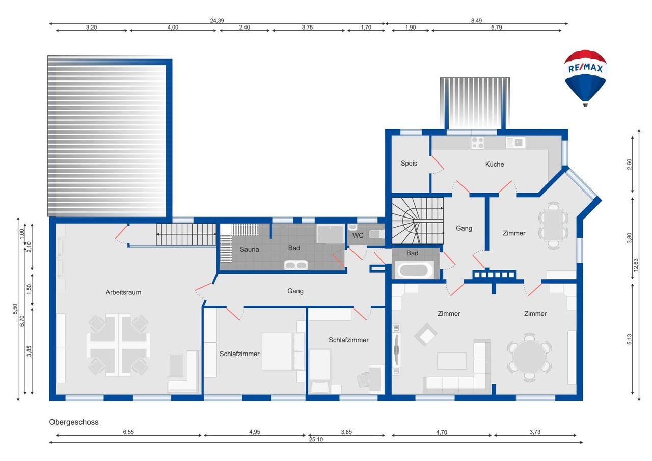 Auf einer Wohnfläche von ca. 560 m² verteilen sich insgesamt 15 Zimmer, die ein Höchstmaß an Flexibilität bieten – ideal für Großfamilien, Mehrgenerationenwohnen, Wohnen & Arbeiten unter einem Dach oder repräsentative Wohnkonzepte.