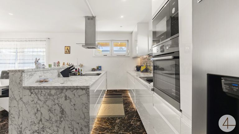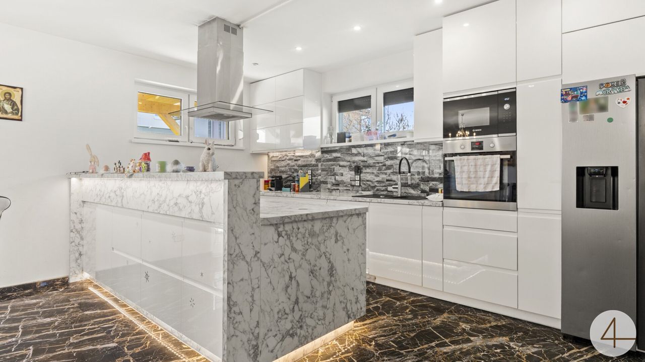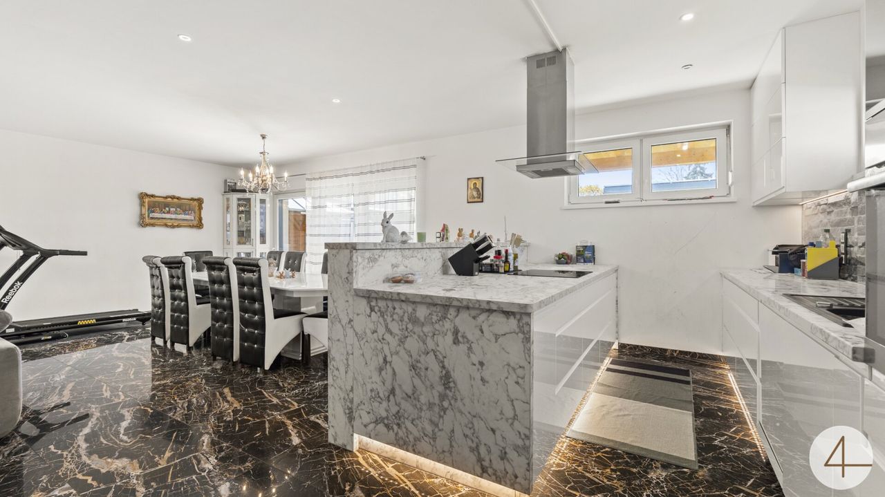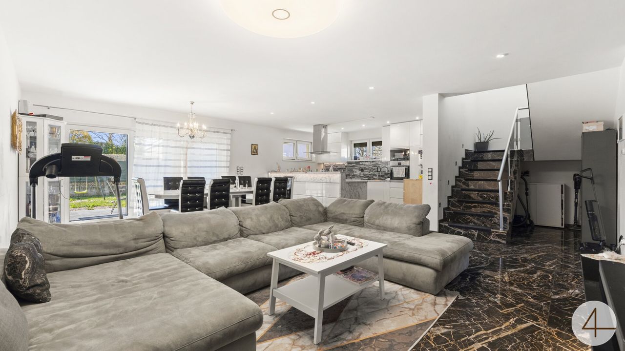 Das Herzstück des Hauses ist der offen gestaltete Wohn- und Essbereich mit direktem Zugang zur sonnigen Natursteinterrasse und dem liebevoll angelegten Garten ein echtes Highlight für entspannte Sommertage und gesellige Abende.