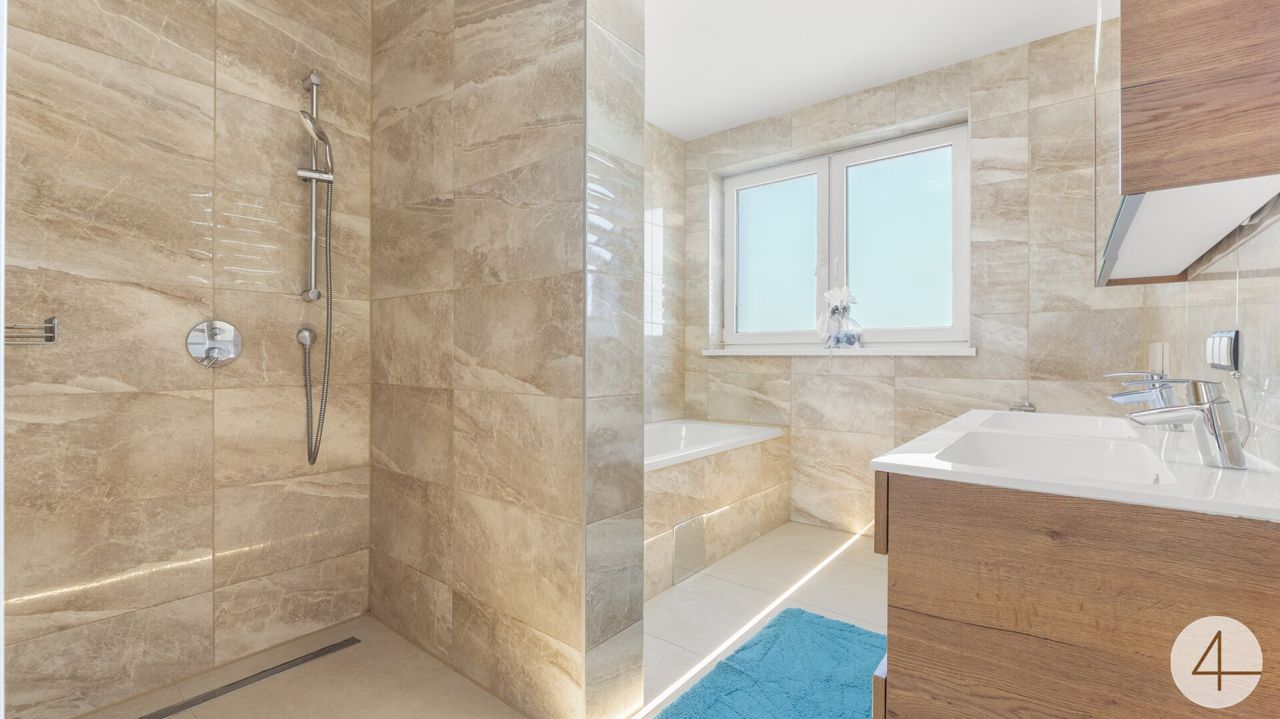 Ein modernes Badezimmer hochwertige 3-fach verglaste Kunststoff-Alufenster sowie außenliegende Rollläden unterstreichen den gehobenen Ausstattungsstandard.