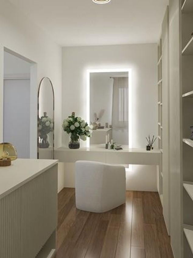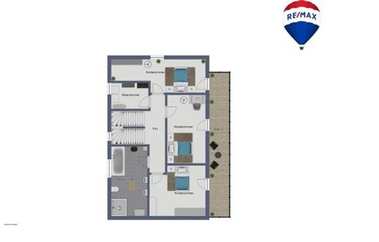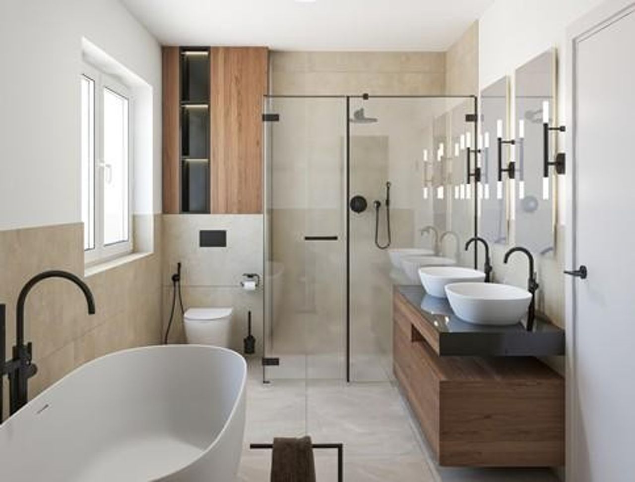 Dieses Haus bietet 5 Zimmer und 3 Bäder sowie Balkon oder Terrasse in jedem der beiden Obergeschosse. Zwei Bäder verfügen über Dusche und Badewanne. Im Dachgeschoss erwartet Sie eine Masterbedroom-Suite mit eigener Ankleide und Badezimmer.