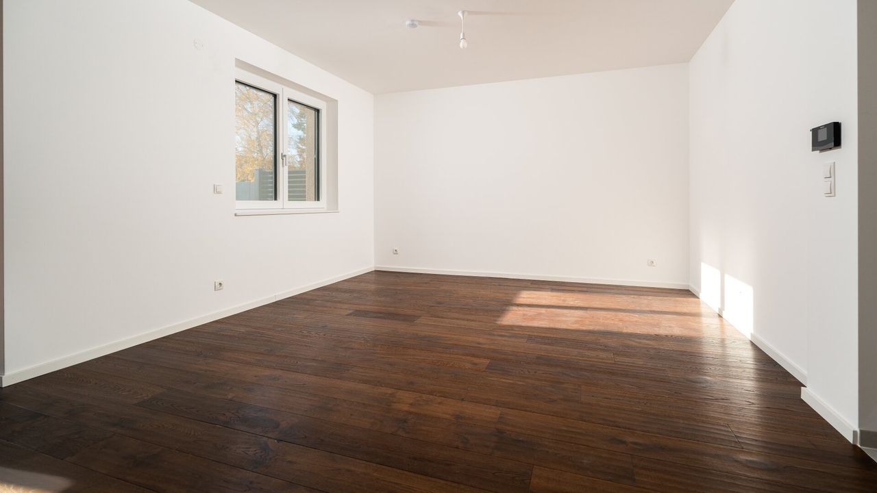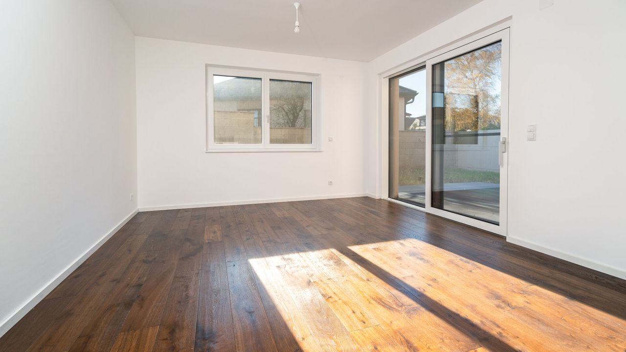 Beim Betreten des Hauses befindet sich rechterhand ein Garderobenbereich, am Ende davon ein WC mit Handwaschbecken. Linkerhand liegt das erste Zimmer, das sich ideal als Homeoffice oder Gästezimmer eignet. Ebenfalls auf dieser Seite befindet sich der Technikraum, in dem die hochwertige Haustechnik untergebracht ist. Unter der Treppe wurde zudem ein praktischer Abstellraum eingeplant.