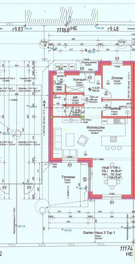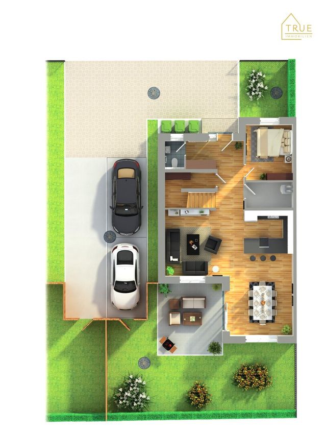 Bereits vom Flur aus öffnet sich der Blick in den hellen und einladenden Wohn-Essbereich – hier ist Wohlfühlen garantiert. Durch die großzügige Hebeschiebetür gelangt man auf die rund 18 m² große Terrasse und weiter in den schönen Gartenbereich. Ein Gartentor führt direkt zu den zwei zugeordneten Stellplätzen, die das Angebot abrunden.
