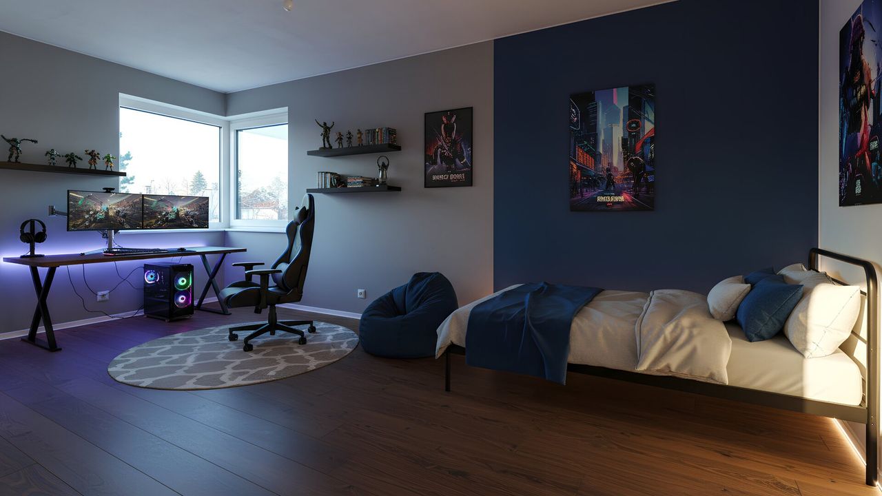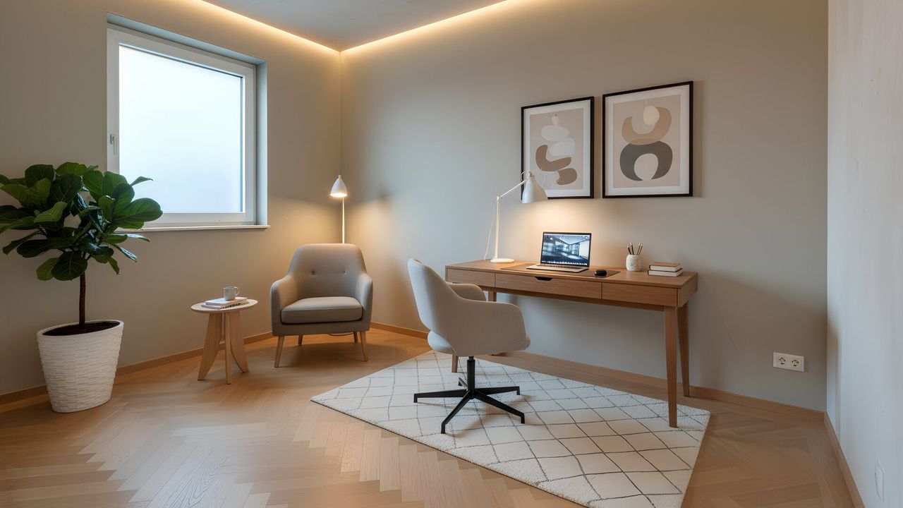 Beim Betreten des Hauses befindet sich rechterhand ein Garderobenbereich, am Ende davon ein WC mit Handwaschbecken. Linkerhand liegt das erste Zimmer, das sich ideal als Homeoffice oder Gästezimmer eignet. Ebenfalls auf dieser Seite befindet sich der Technikraum, in dem die hochwertige Haustechnik untergebracht ist. Unter der Treppe wurde zudem ein praktischer Abstellraum eingeplant.