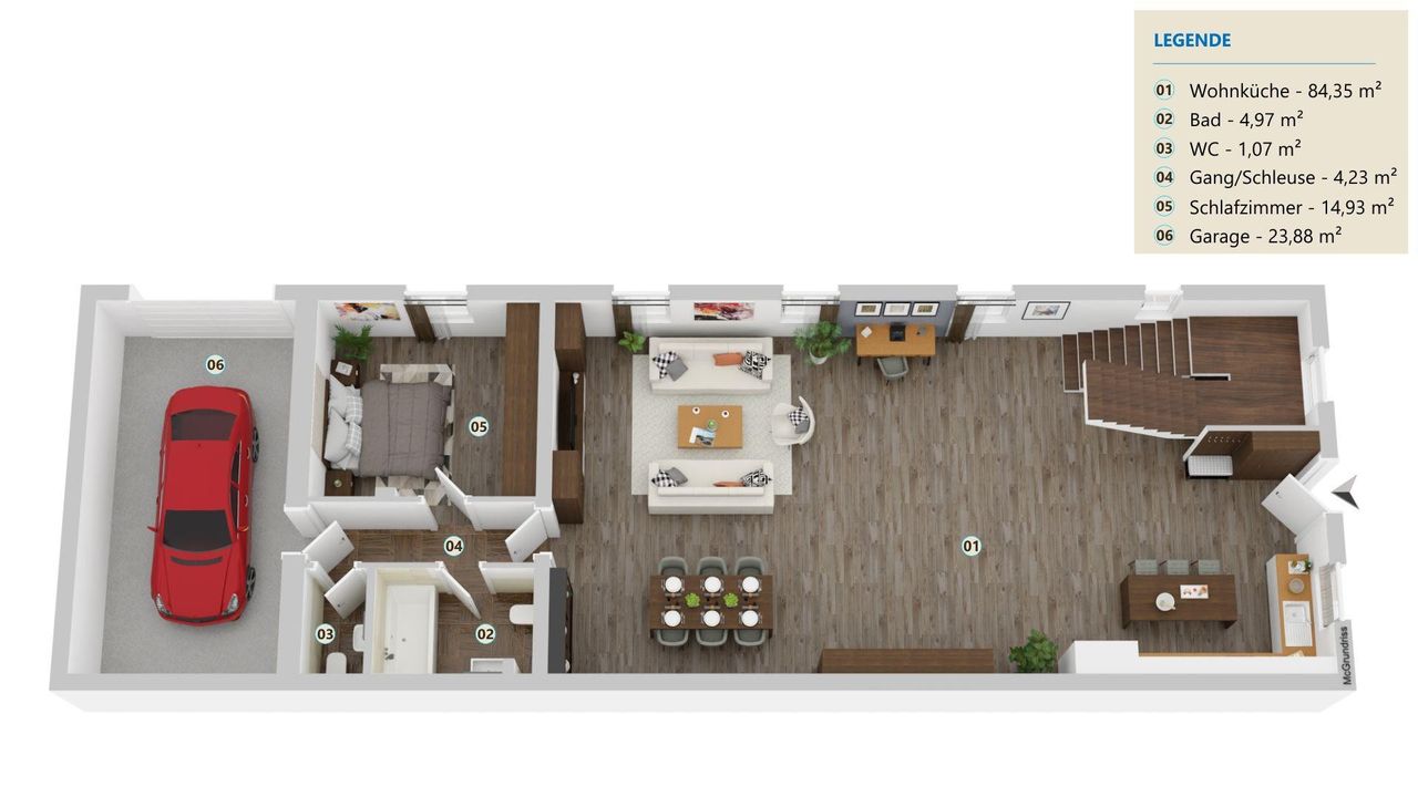 Wohnküche, Schlafzimmer, Badezimmer/WC, Zugang zur Garage