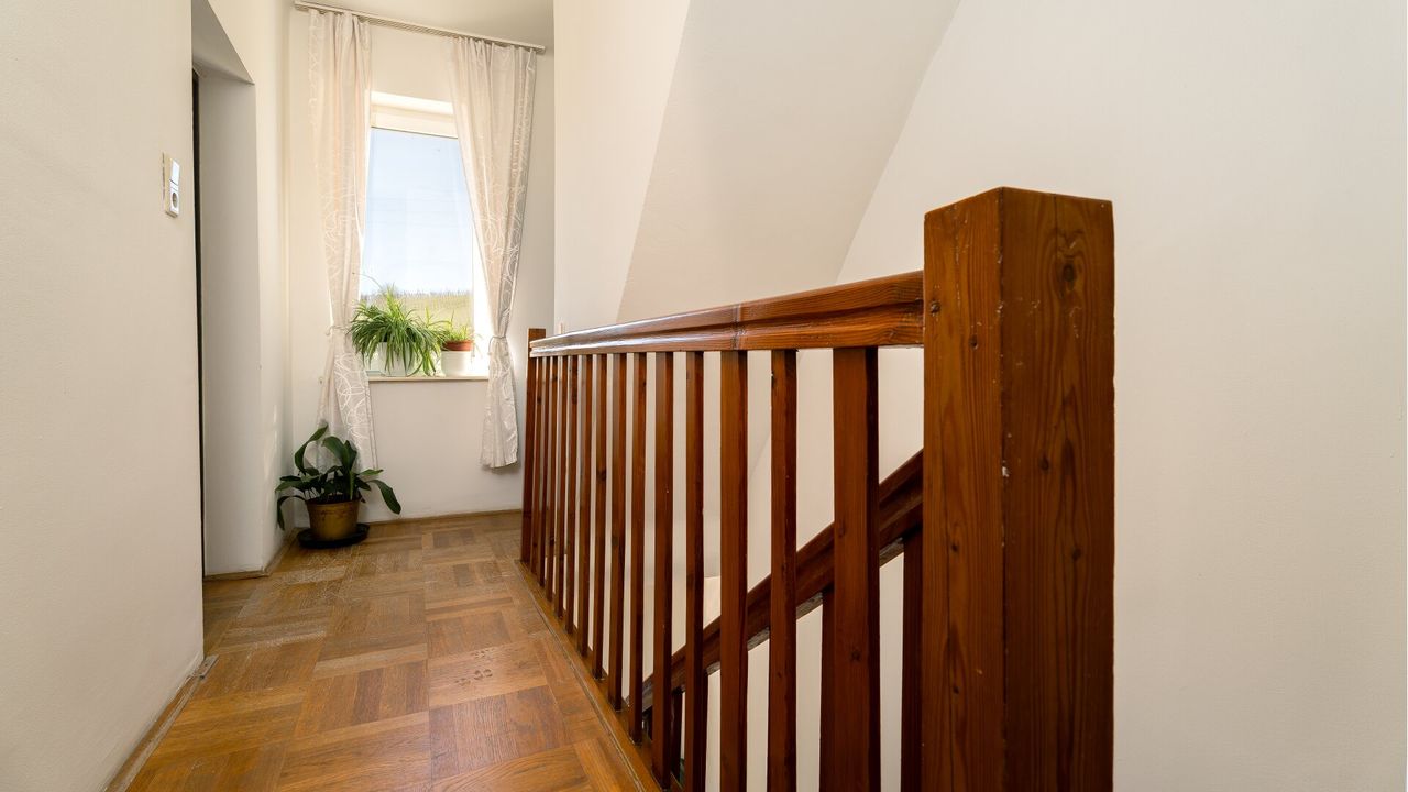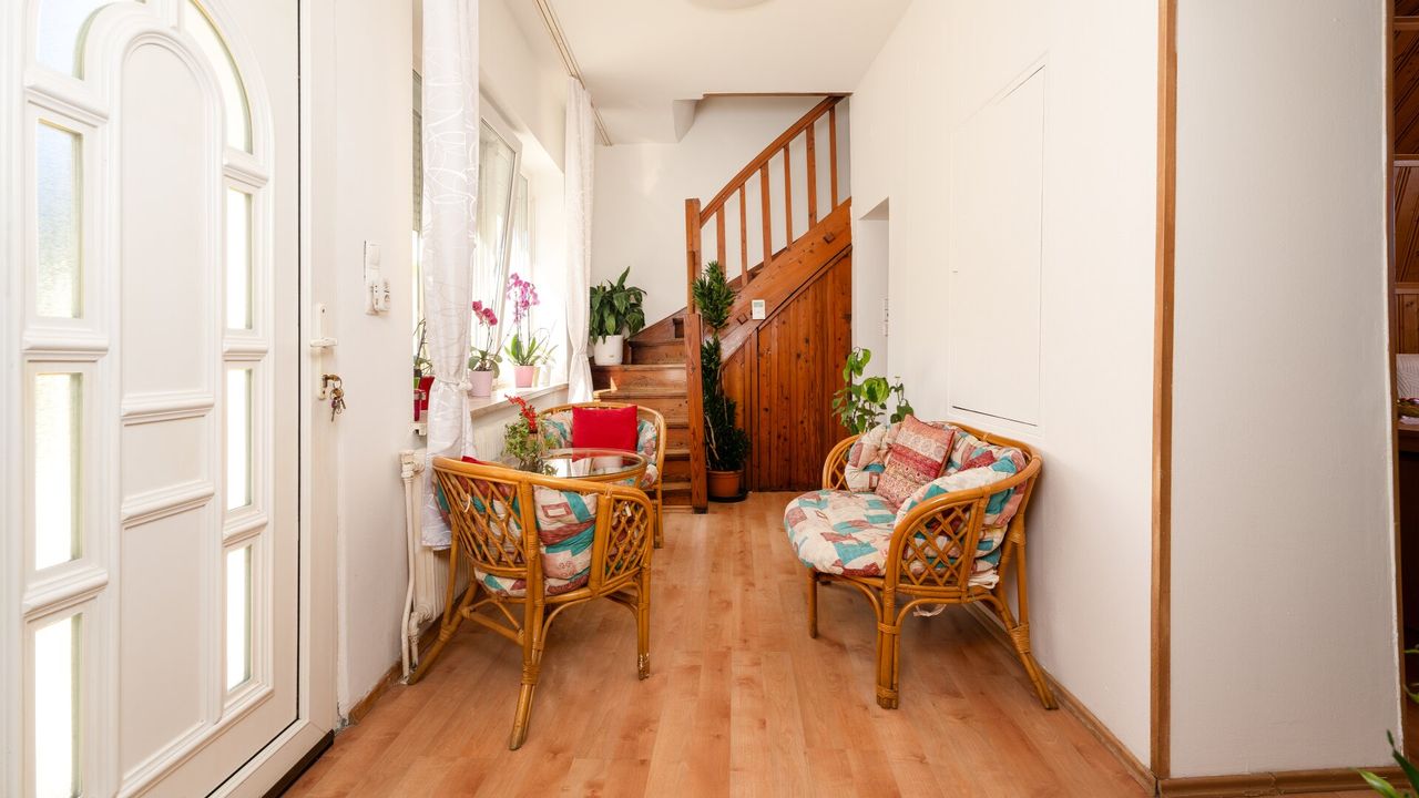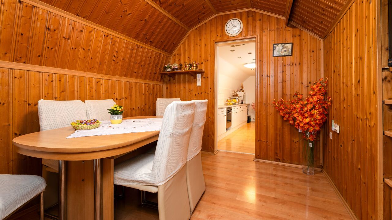 Das Haus verfügt über eine durchdachte Raumaufteilung auf mehreren Ebenen. Im Erdgeschoss befinden sich der Eingangsbereich, ein gemütliches Wohnzimmer, ein separates Esszimmer, die Küche sowie ein Badezimmer. Das Obergeschoss bietet ausreichend Platz mit einem Schlafzimmer, einem weiteren Zimmer sowie einem Ankleidezimmer.