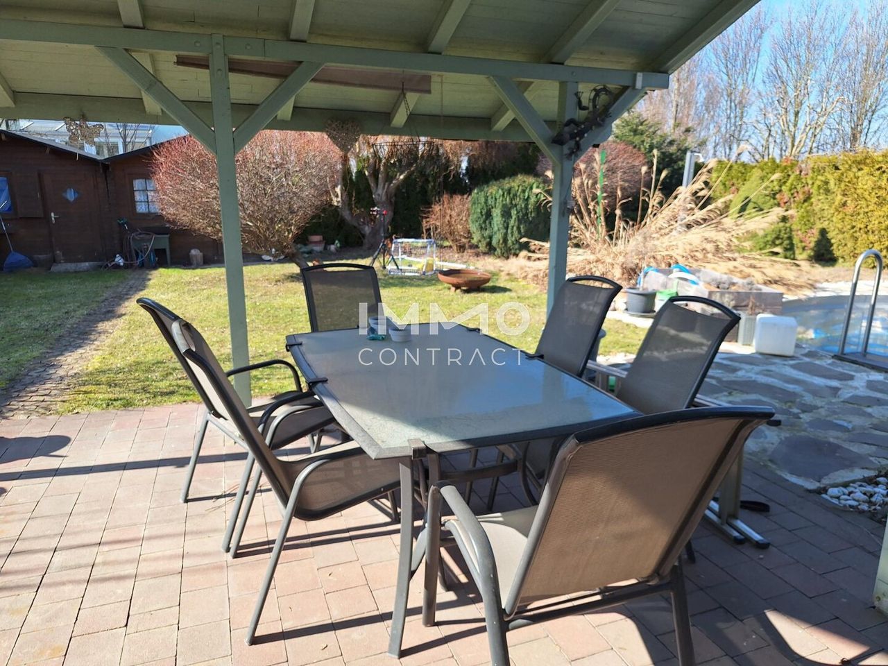 - Pergola: Die Terrasse wird durch eine Pergola beschattet, die statisch die Installation einer Photovoltaikanlage ermöglicht.