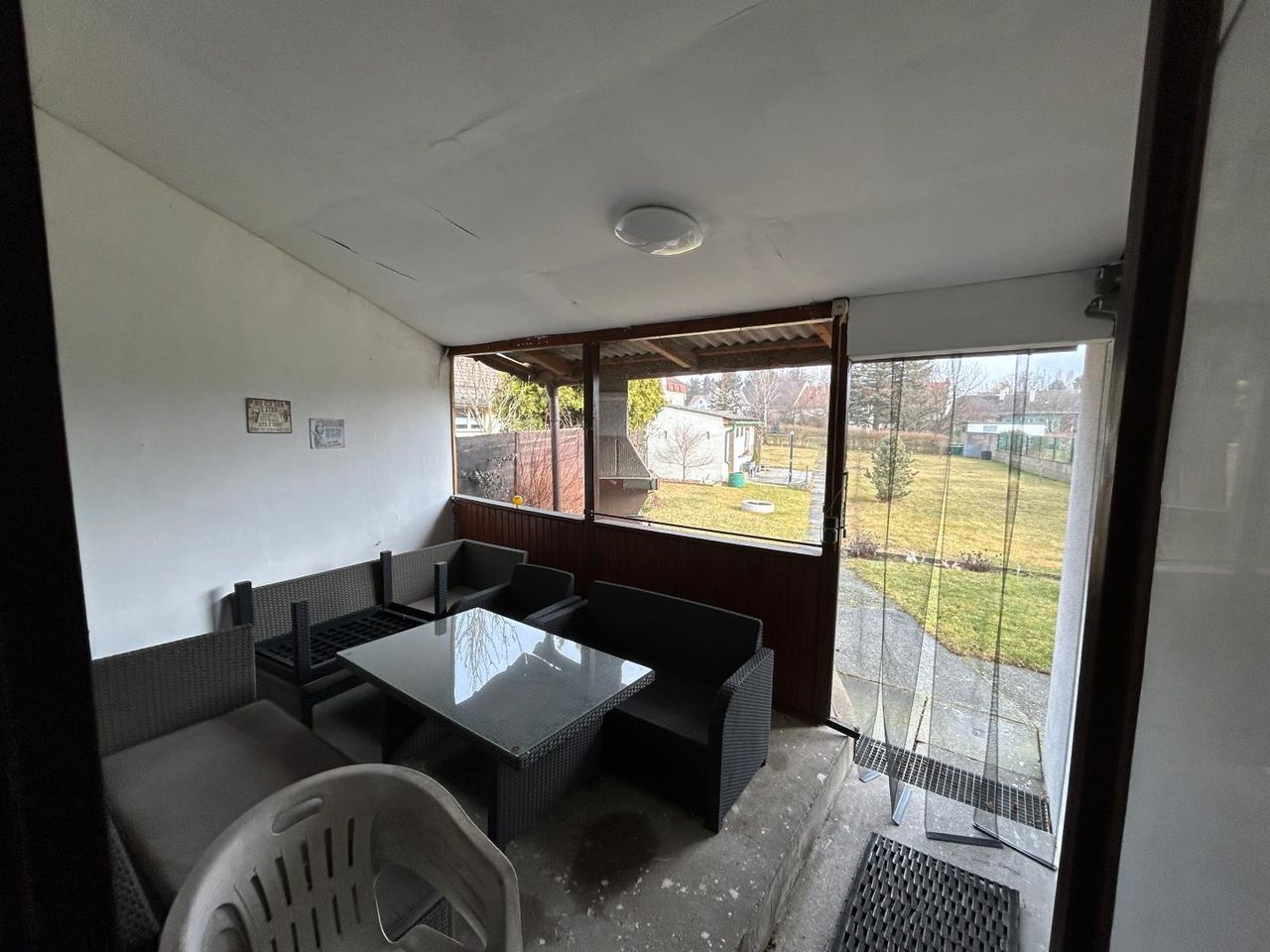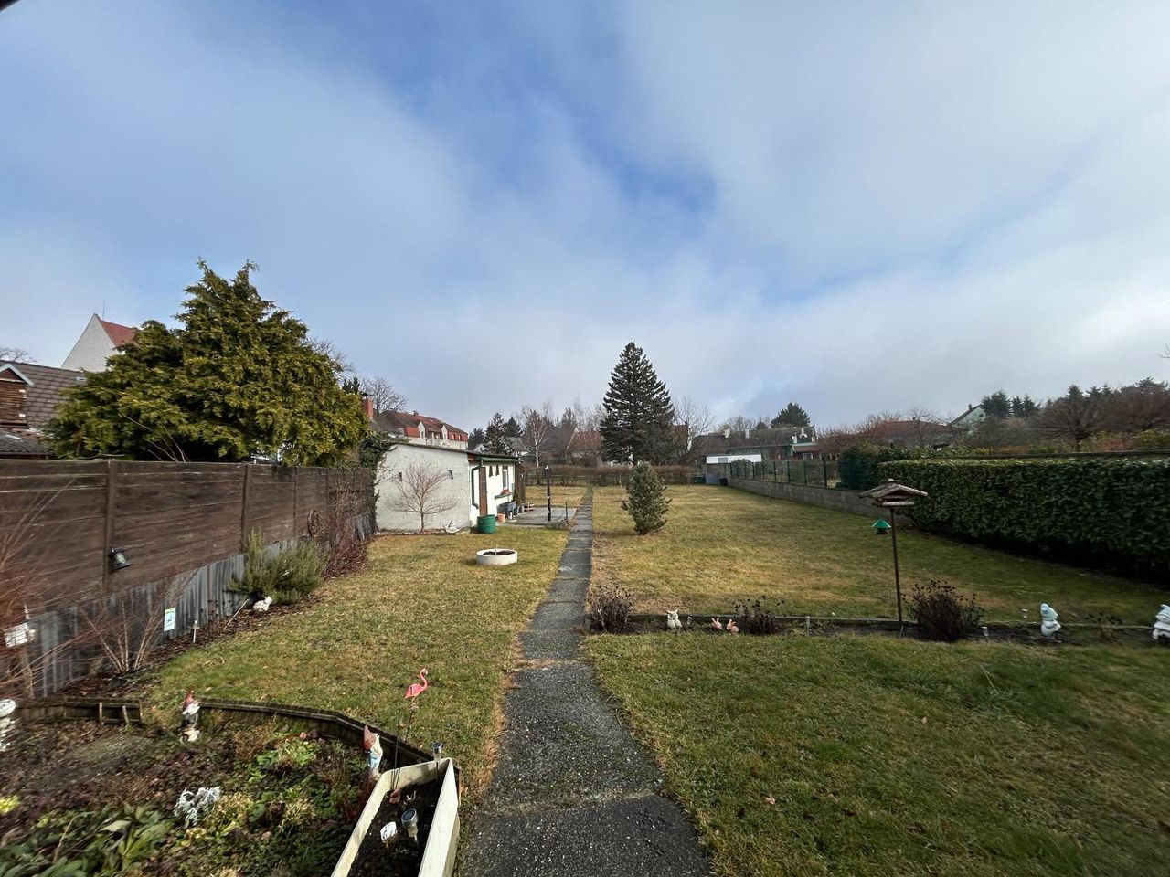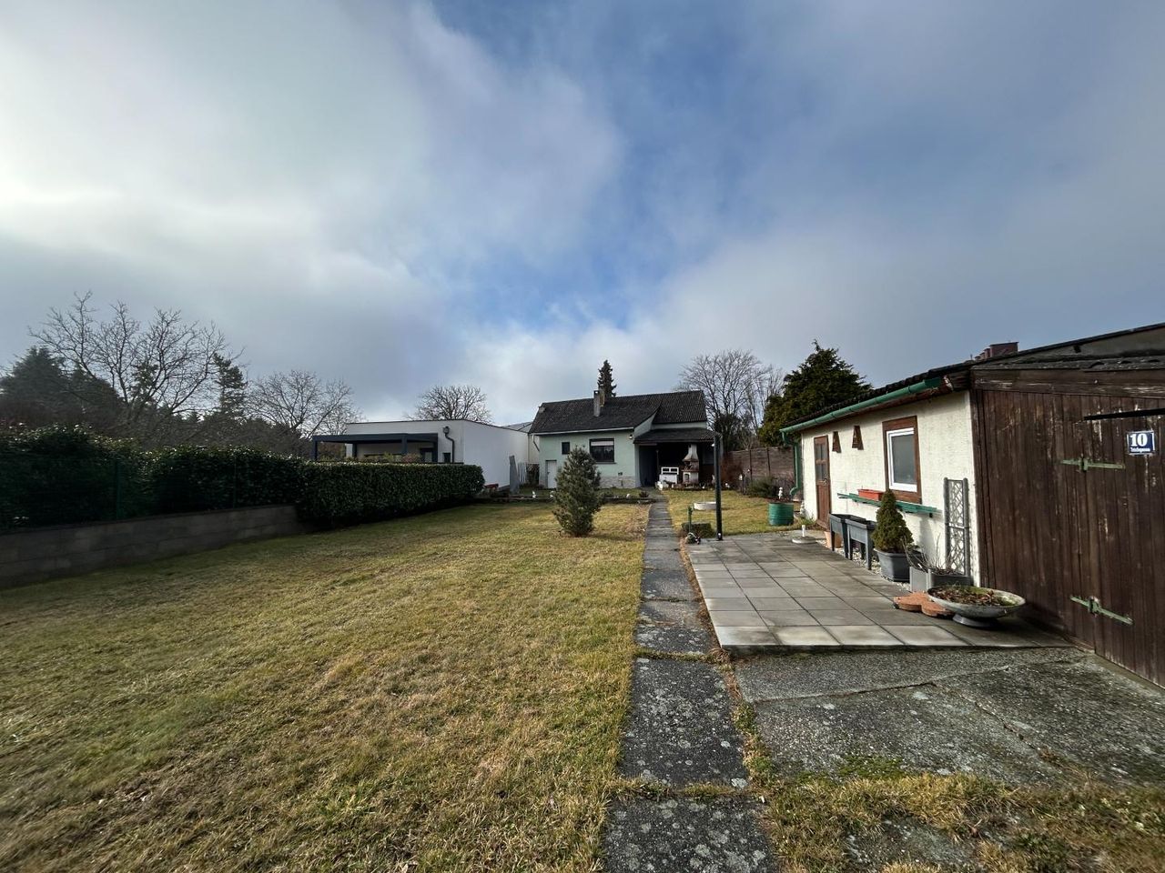 Die Liegenschaft verfügt zudem über eine Garage mit direktem Zugang zum Grundstück. Ein befestigter Weg führt vom Haus bis in den hinteren Gartenbereich.