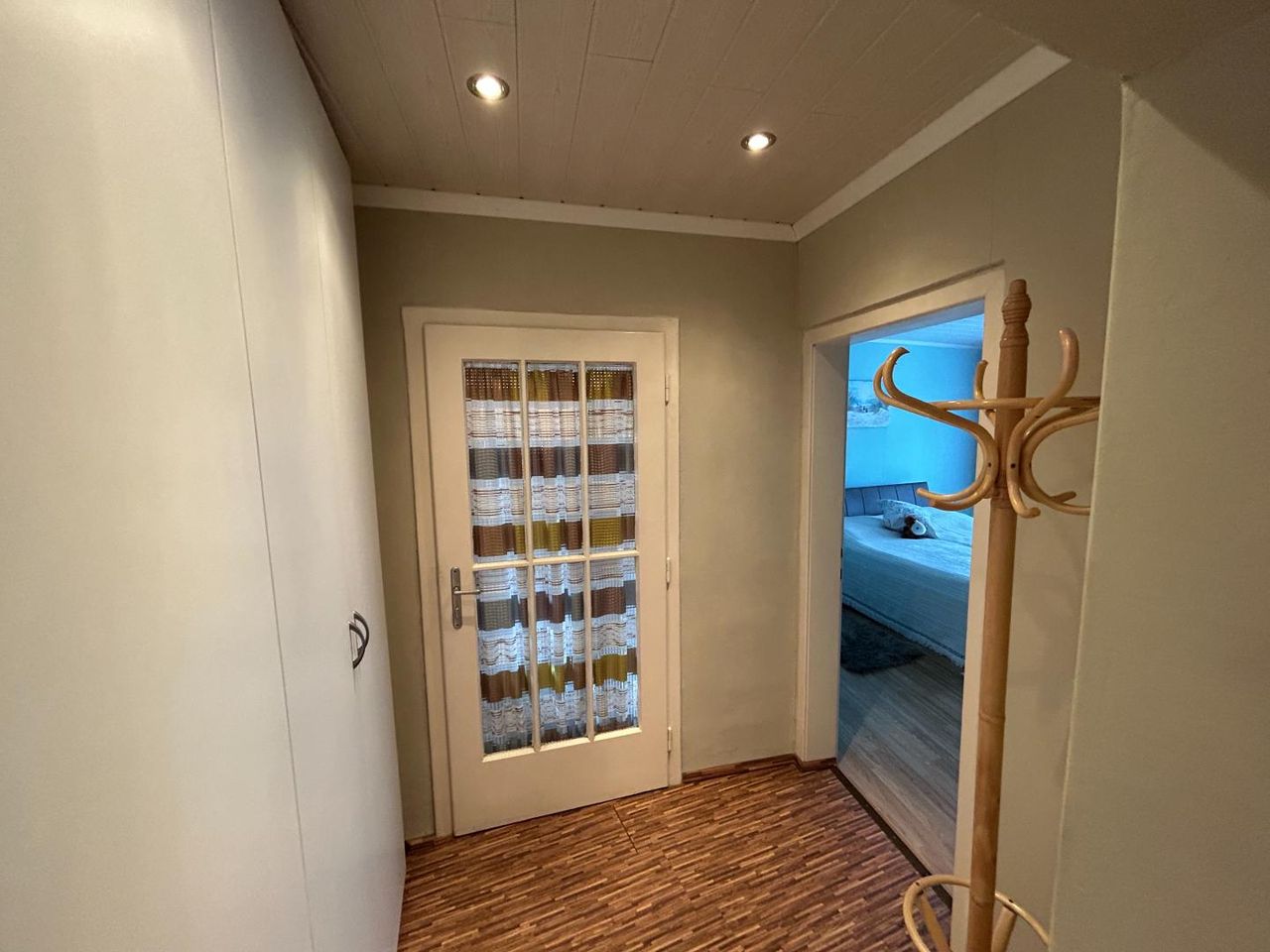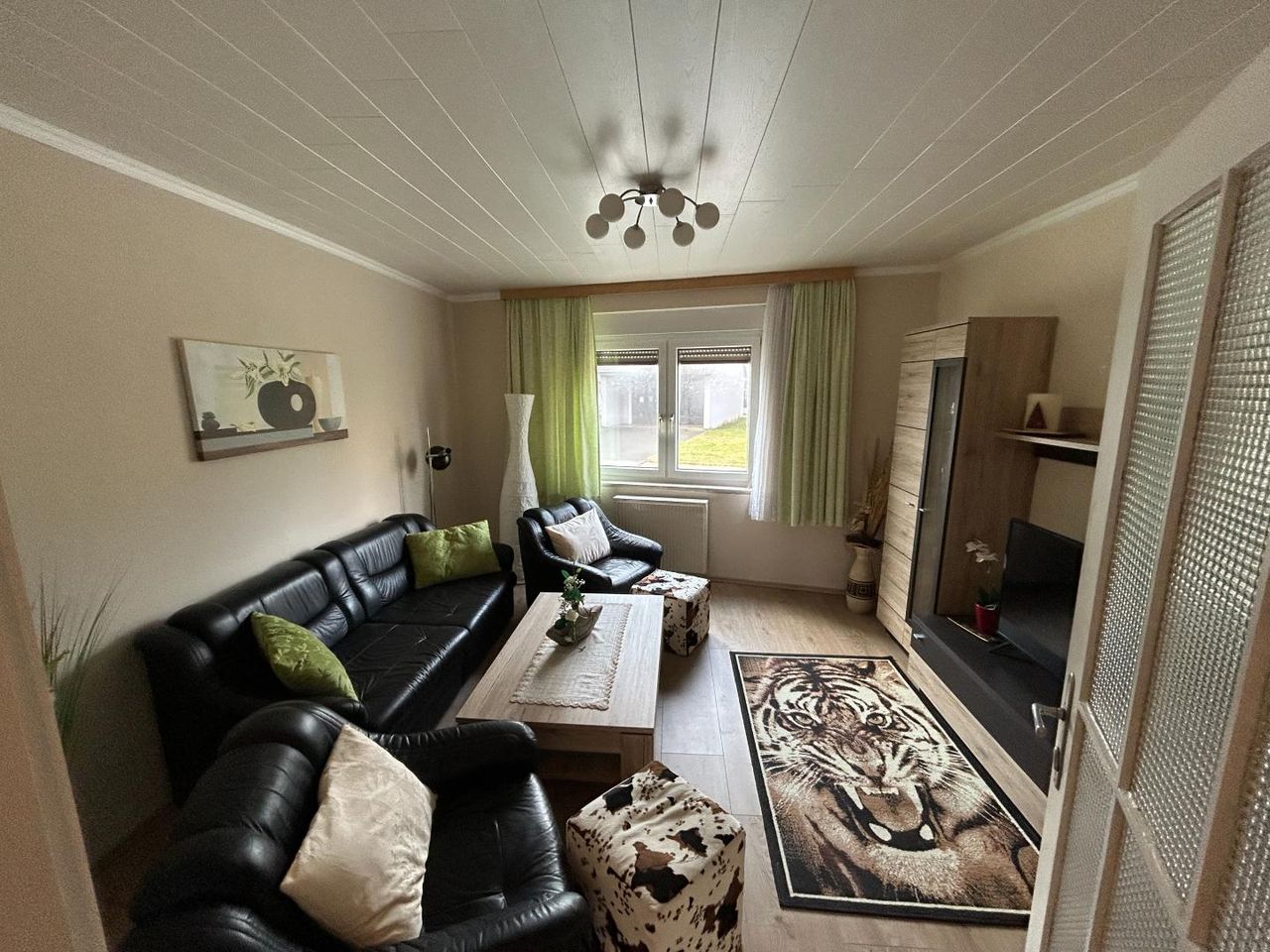 Der helle Wohnbereich ist freundlich gestaltet und bietet durch das große Fenster einen schönen Blick ins Grüne. Warme Holzelemente und eine harmonische Farbgestaltung schaffen eine angenehme Wohnatmosphäre. Die angrenzenden Räume lassen sich flexibel als Schlafzimmer, Arbeitszimmer oder Gästezimmer nutzen.
