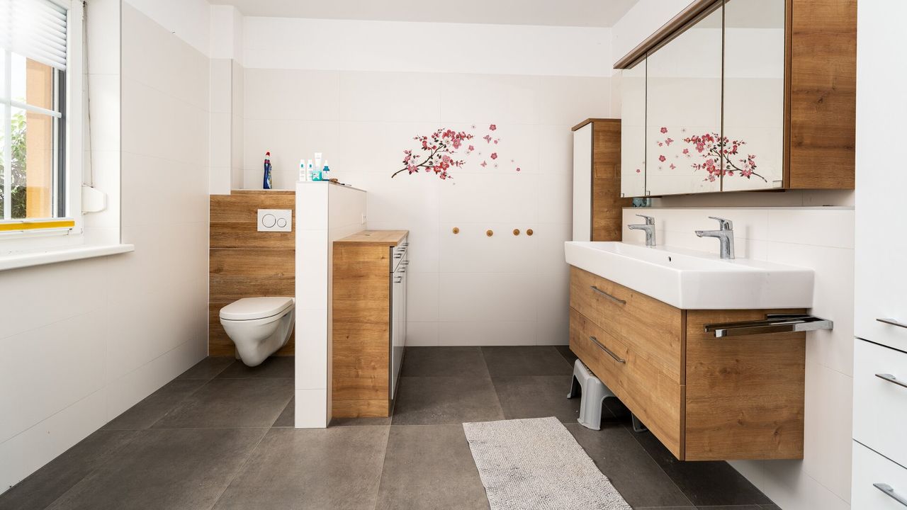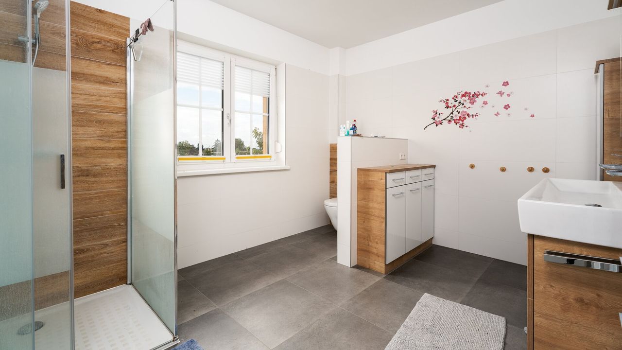 Im Obergeschoß angekommen, stehen Ihnen rechter und linker Hand insgesamt 3 Zimmer zur Verfügung. Weiters gelangen Sie in ein Bad mit Dusche und WC.