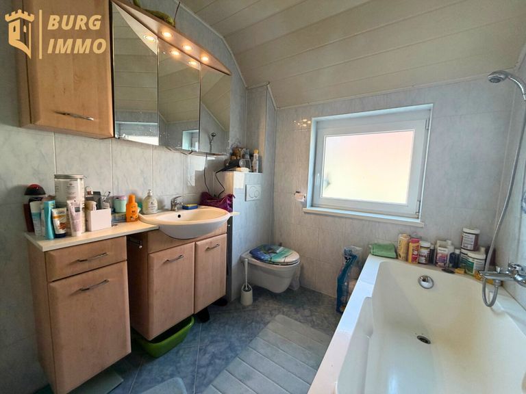 Badezimmer mit Badewanne, Dusche, WC und Fenster
