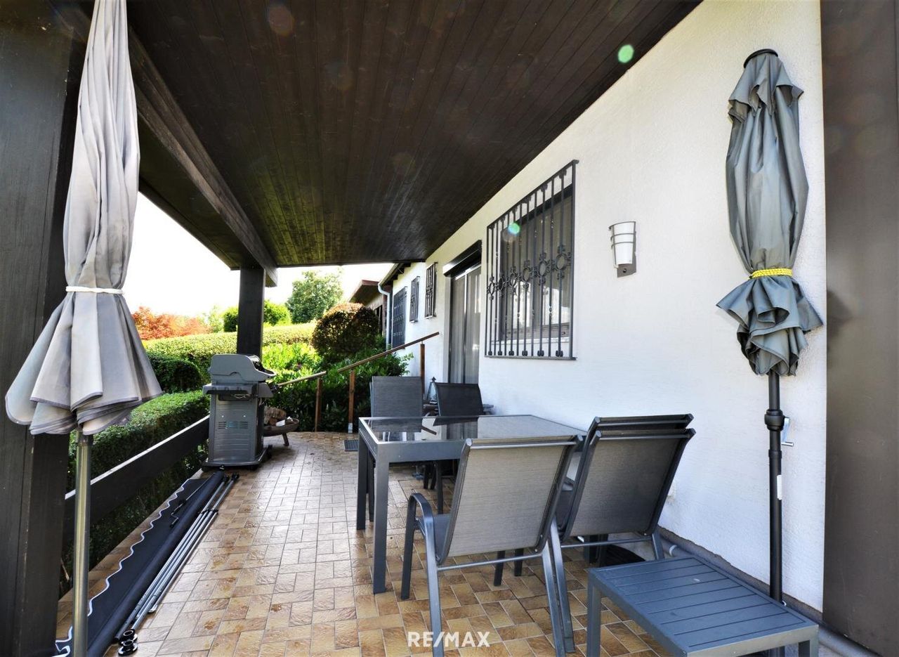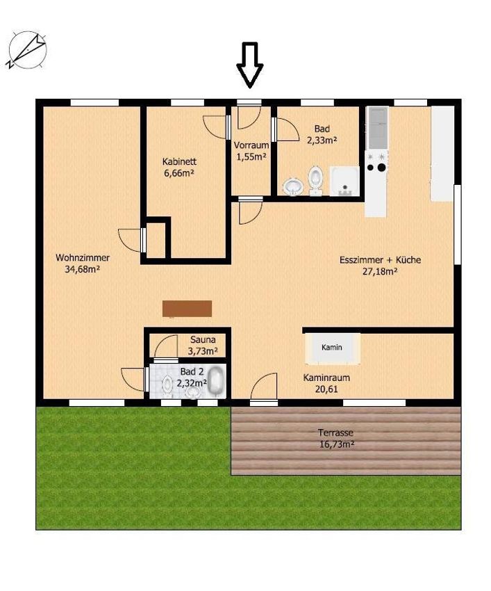 Der offene Wohnbereich lädt mit einer Bar und einem offenen Kamin zu geselligen Stunden und gemütlichen Abenden ein. Die Küche ist zweckmäßig ausgestattet und erfüllt alle Anforderungen für den Alltag. Zwei weitere Zimmer bieten sich als Schlaf-, Gäste- oder Arbeitsraum an. Besonders hervorzuheben ist die großzügige, überdachte Terrasse, die nicht nur Schutz vor Sonne und Wetter bietet, sondern auch einen idealen Ort zum Entspannen mit Blick ins Grüne darstellt.