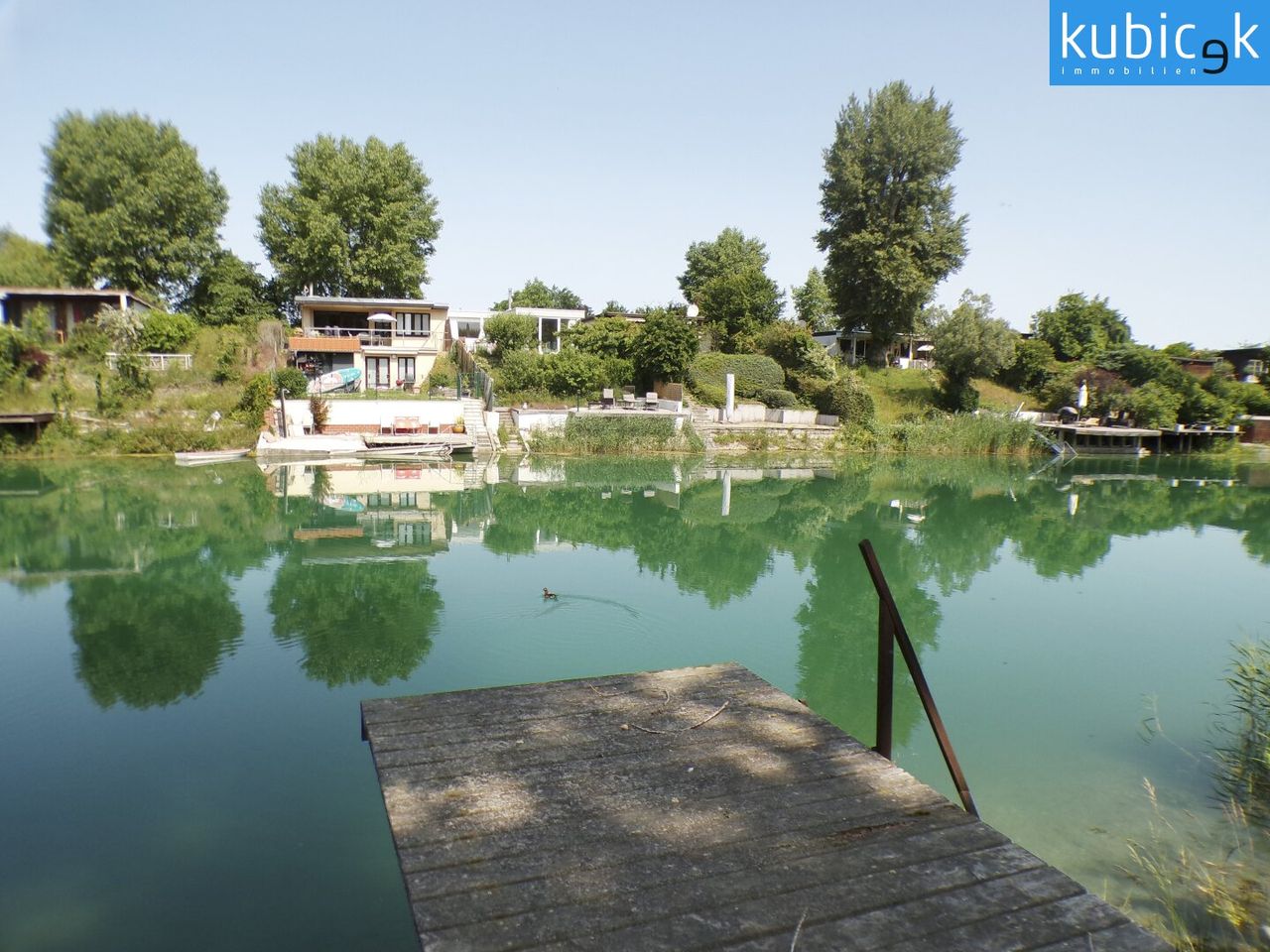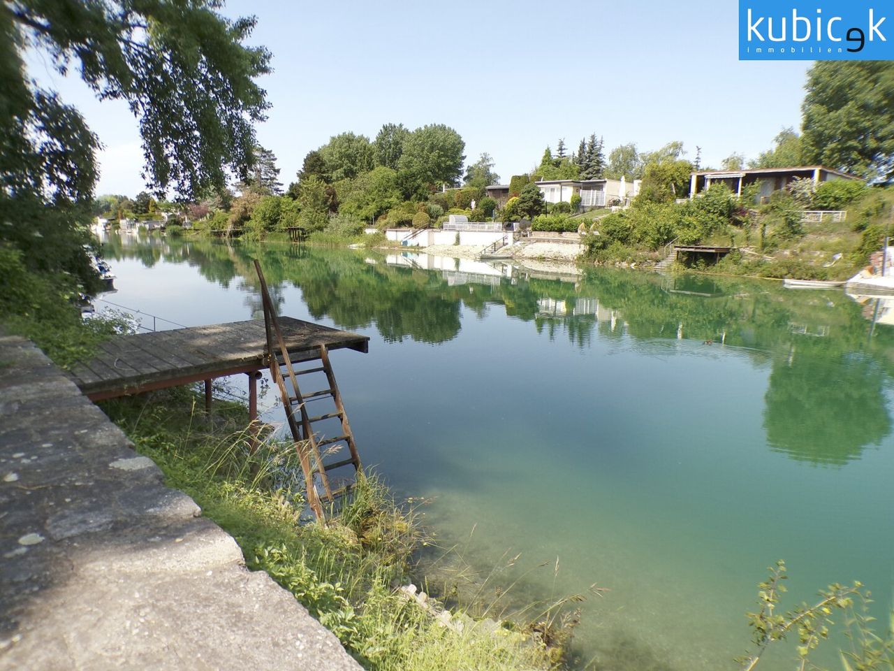 Ein absolutes Highlight ist der Holzsteg im unteren Bereich des Grundstücks – hier lässt sich der Blick über das türkisfarbene Wasser schweifen und der Alltag vergessen. Die nordwestliche Ausrichtung der Parzelle garantiert sonnige Abendstunden und romantische Sonnenuntergänge.