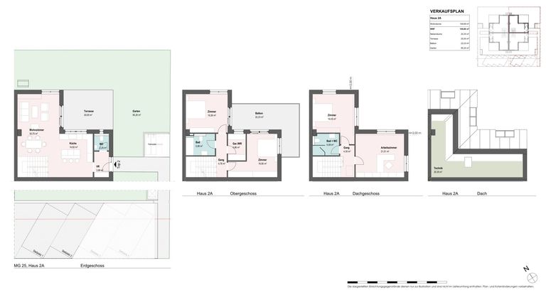 - WC im EG, jeweils 1x Badezimmer im OG und DG