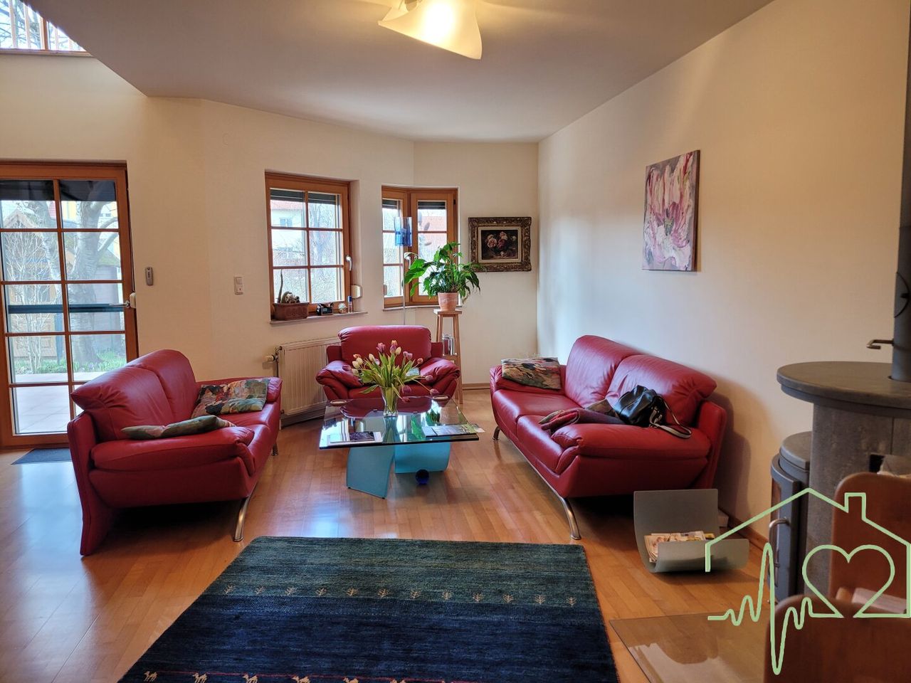 Das Wohnzimmer ist räumlich in einen Ess- und Wohnbereich getrennt und verfügt über einen Kaminofen.