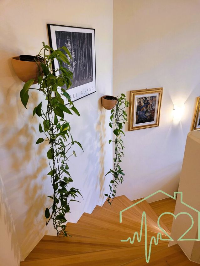 Über die Treppe gelangt man in das Obergeschoss, wo sich 3 Zimmer, eines davon mit Balkon und ein Bad mit Badewanne und Toilette befinden. Im komplett ausgebauten Dachgeschoss ist ein weiteres Schlafzimmer, ein Bad mit Dusche, Toilette und Bidet und ein großes, sehr helles Arbeitszimmer.