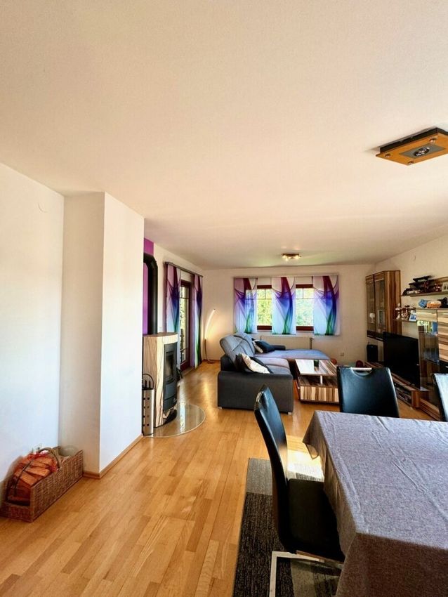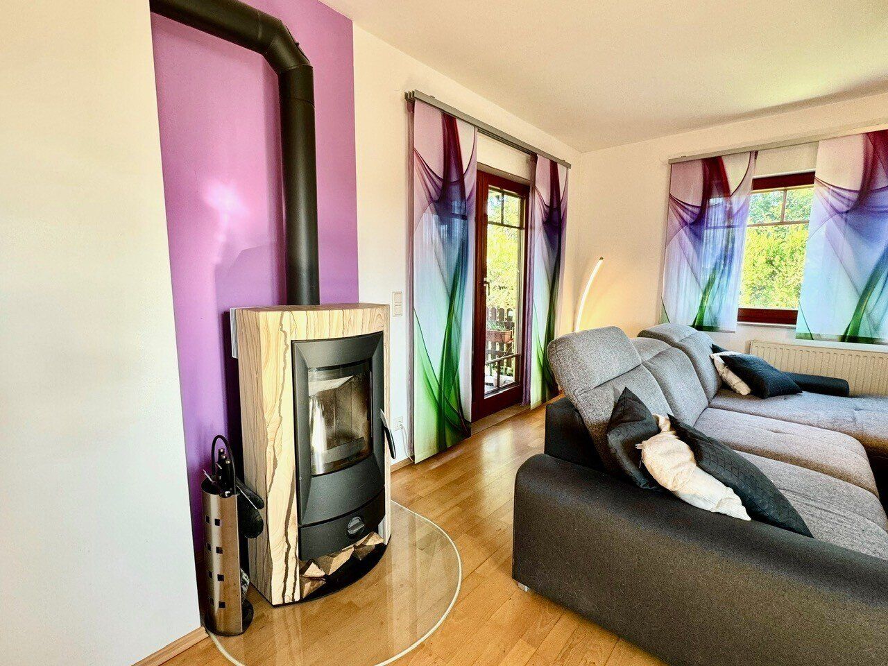 Wohnzimmer: Weitläufiger, lichtdurchfluteter Raum mit Zugang zur Terrasse und gemütlichem Schwedenofen – sorgt für behagliche Wärme und trägt zum nachhaltigen Wohnkonzept bei