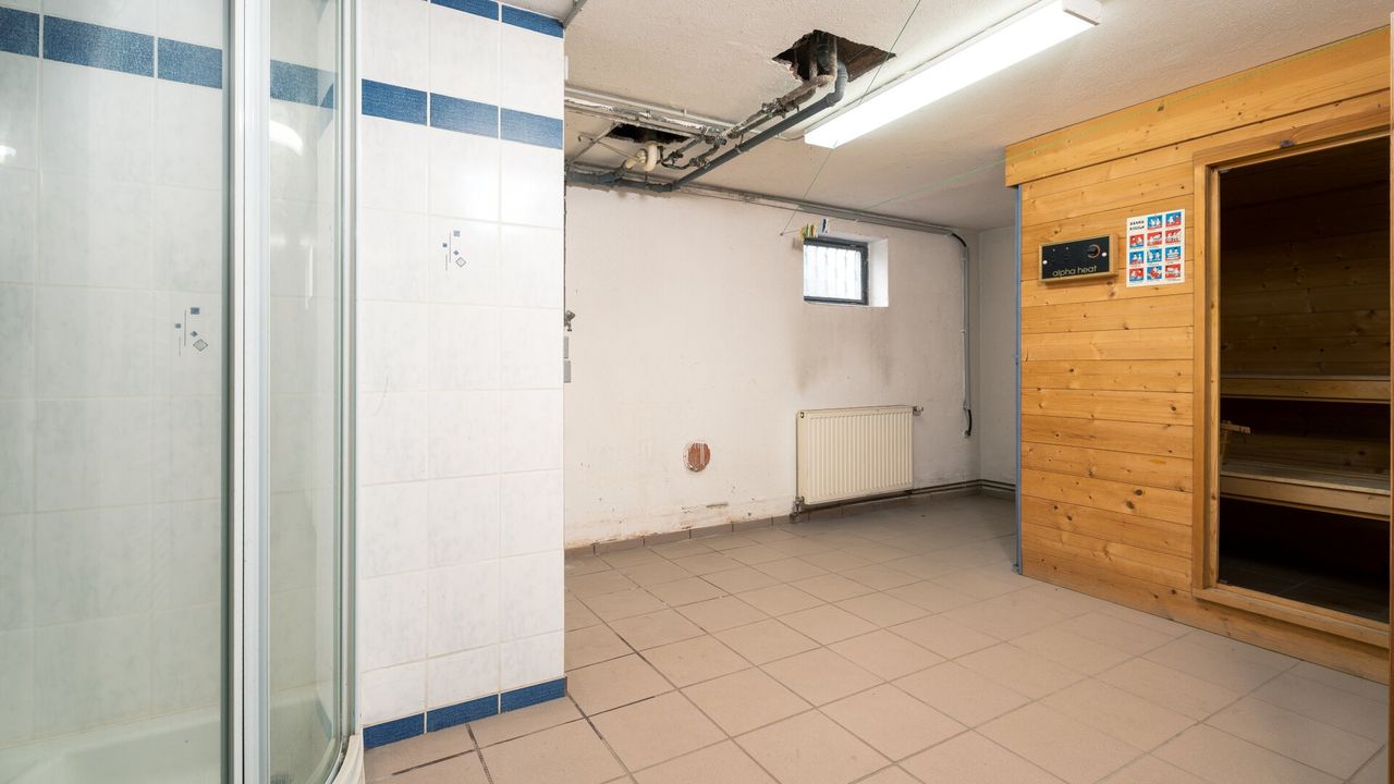 In einem weiteren Bereich wurde ein kleiner Saunabereich mit Dusche und WC eingerichtet. Zudem befindet sich hier eine integrierte Brunnenpumpe, welche für die Gartenbewässerung genutzt wird.