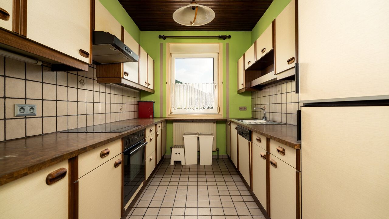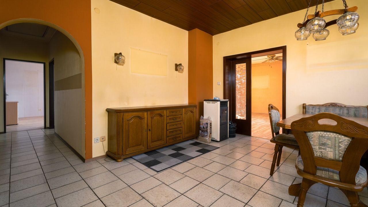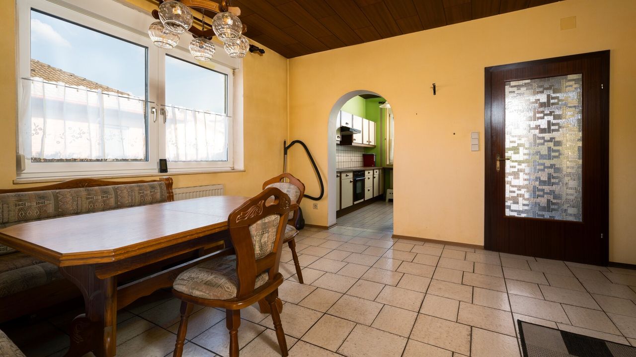 Geradeaus betreten Sie das Esszimmer, in dem sich auch ein Pelletsofen befindet – ideal für zukünftige Kamin- oder Kachelofenlösungen. Rechts anschließend liegt die Küche mit angenehmer Größe.