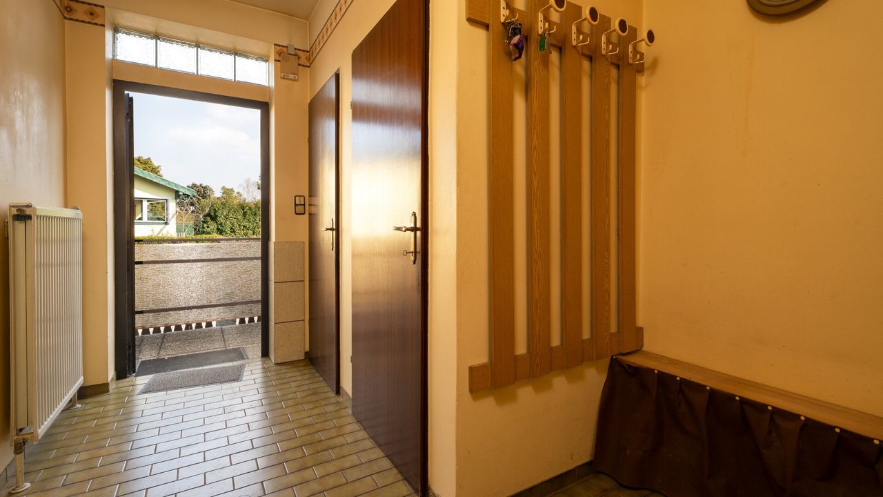 Der Vorraum bietet ausreichend Platz für Jacken und Schuhe. Linkerhand befindet sich ein separates WC mit Fenster, daneben der Abgang in den Keller.