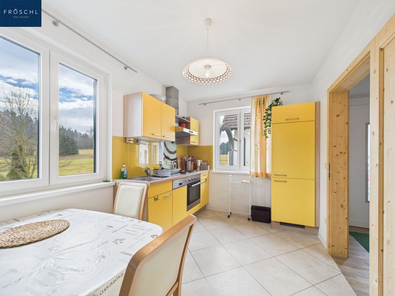 Das Herzstück der Liegenschaft bildet das großzügige Hauptwohnhaus im Erdgeschoss. Eine einladende Diele empfängt den Besucher und erschließt alle Räumlichkeiten des Hauses. Das weitläufige Wohn- und Esszimmer mit offener Küche und direktem Zugang zum Wintergarten schafft ein Raumgefühl, das Wärme und Großzügigkeit gleichermaßen vermittelt. Der lichtdurchflutete Wintergarten bietet das ganze Jahr über einen ungehinderten Blick in die unberührte Waldviertler Natur. Zwei Schlafzimmer sowie ein vollausgestattetes Badezimmer mit Badewanne, Dusche und Bidet sorgen für Rückzug und Komfort; die hauseigene Sauna lädt nach einem langen Tag zur wohlverdienten Entspannung ein. Über eine Terrasse mit Loggia in südöstlicher Ausrichtung gelangt man direkt ins Freie. Böden in Fliesen, Laminat und Parkett sowie Mehrfachverglasung und kontrollierte Wohnraumlüftung unterstreichen den gehobenen Ausstattungsstandard.