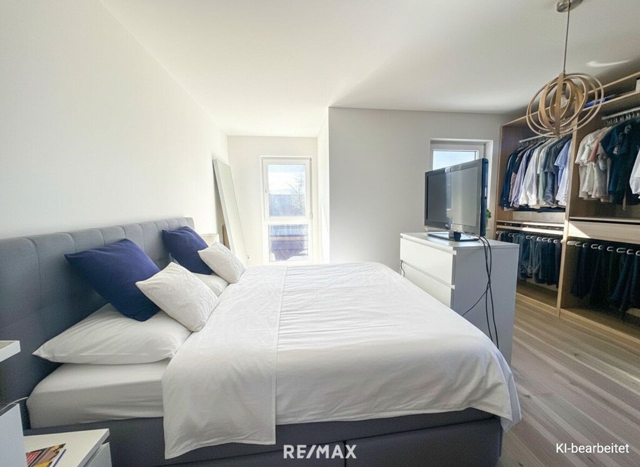 Von der großzügigen Doppelgarage sowie den davorliegenden Stellplätzen gelangen Sie über einen einladenden Zugang in das Haus. Im Erdgeschoss empfängt Sie ein Vorraum, von dem aus Sie ein Büro mit direktem Zugang zur Terrasse, ein Gäste-WC sowie den großzügigen und gemütlichen Wohnbereich betreten. Ein zentral platzierter Holzofen sorgt hier für eine besonders behagliche Atmosphäre. Beheizt wird das Haus mittels moderner Luftwärmepumpe in Kombination mit komfortabler Fußbodenheizung.
