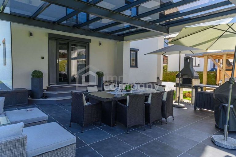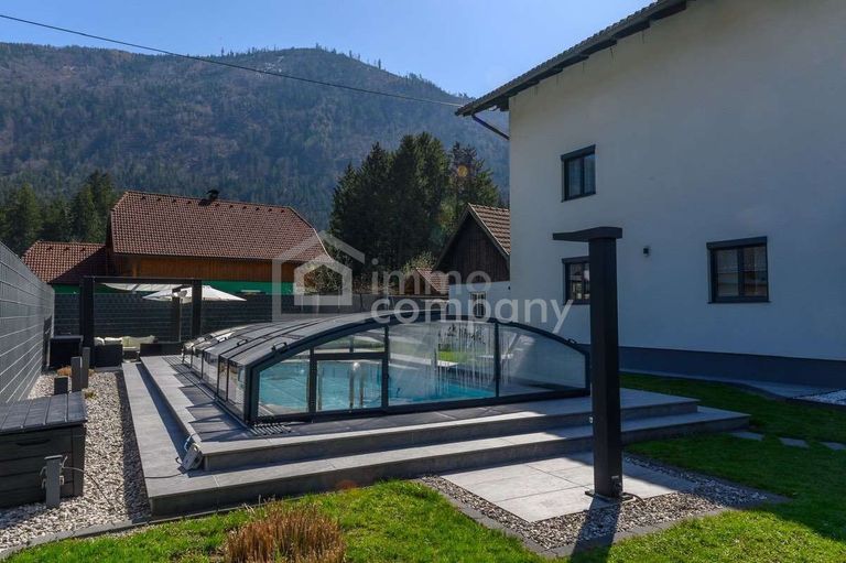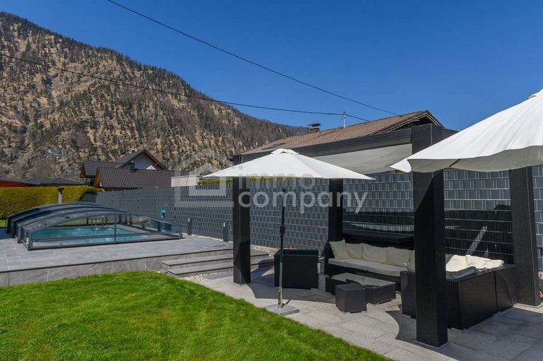 Das ca. 1.119 m² große Grundstück besticht durch einen gepflegten, pflegeleicht angelegten Garten mit umlaufender Einfriedung, die für Privatsphäre sorgt. Die großzügige, überdachte Hauptterrasse bietet einen wunderschönen Blick auf die Berge sowie ein beeindruckendes Bergpanorama. Eine Glasschiebewand schützt zusätzlich vor Wind, während ein vorhandener TV-Anschluss den Außenbereich perfekt ergänzt. Der moderne Außenpool mit Überdachung rundet das hochwertige Gesamtbild ab.