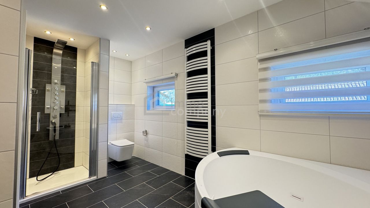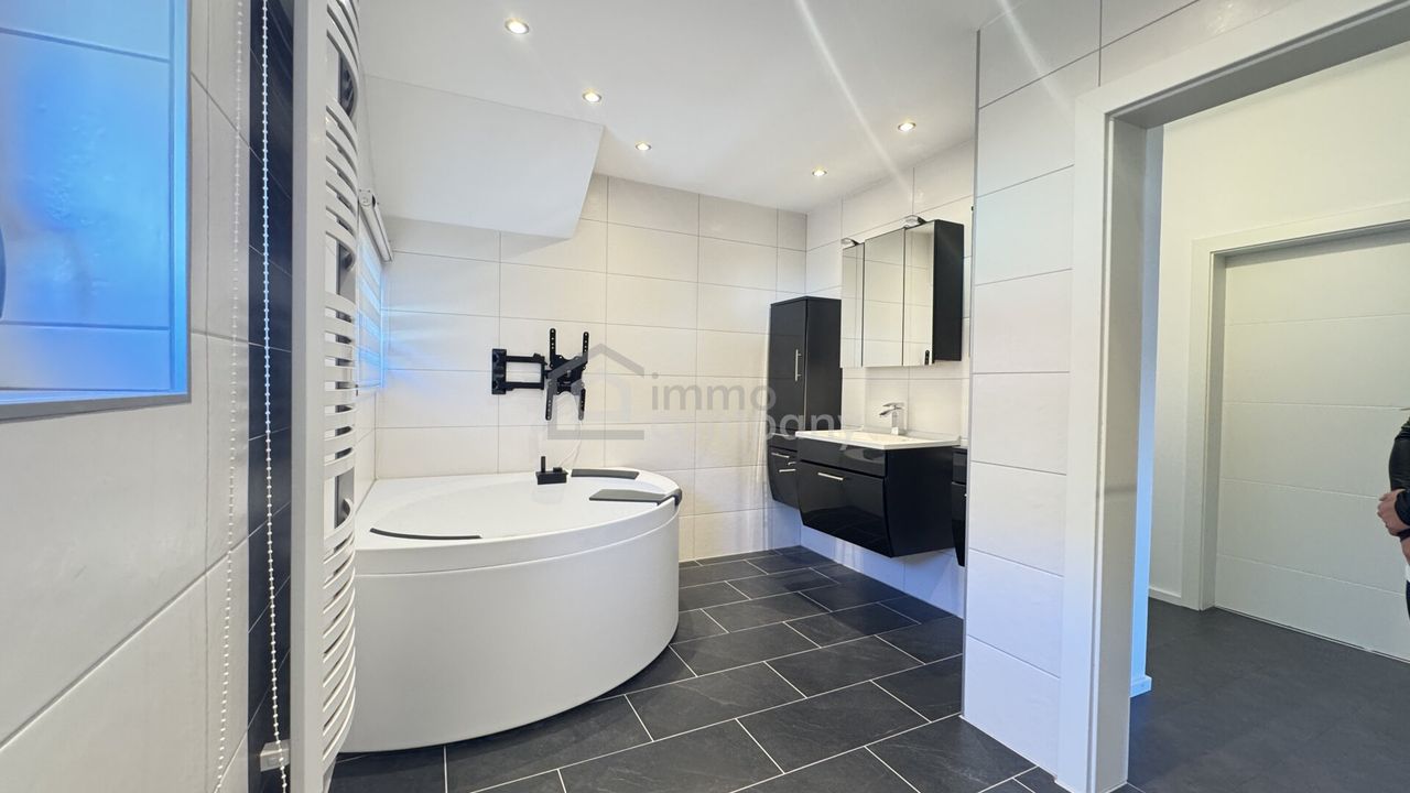 Insgesamt stehen fünf Zimmer zur Verfügung, darunter ein großzügiger Wohn- und Essbereich mit direktem Zugang zur Terrasse und in den Garten. Die moderne Küche ist funktional gestaltet und bietet viel Platz für kulinarische Entfaltung. Das Badezimmer präsentiert sich zeitgemäß ausgestattet mit Dusche und Whirlpool-Badewanne. Ein zusätzliches Gäste-WC im Erdgeschoss sorgt für zusätzlichen Komfort.