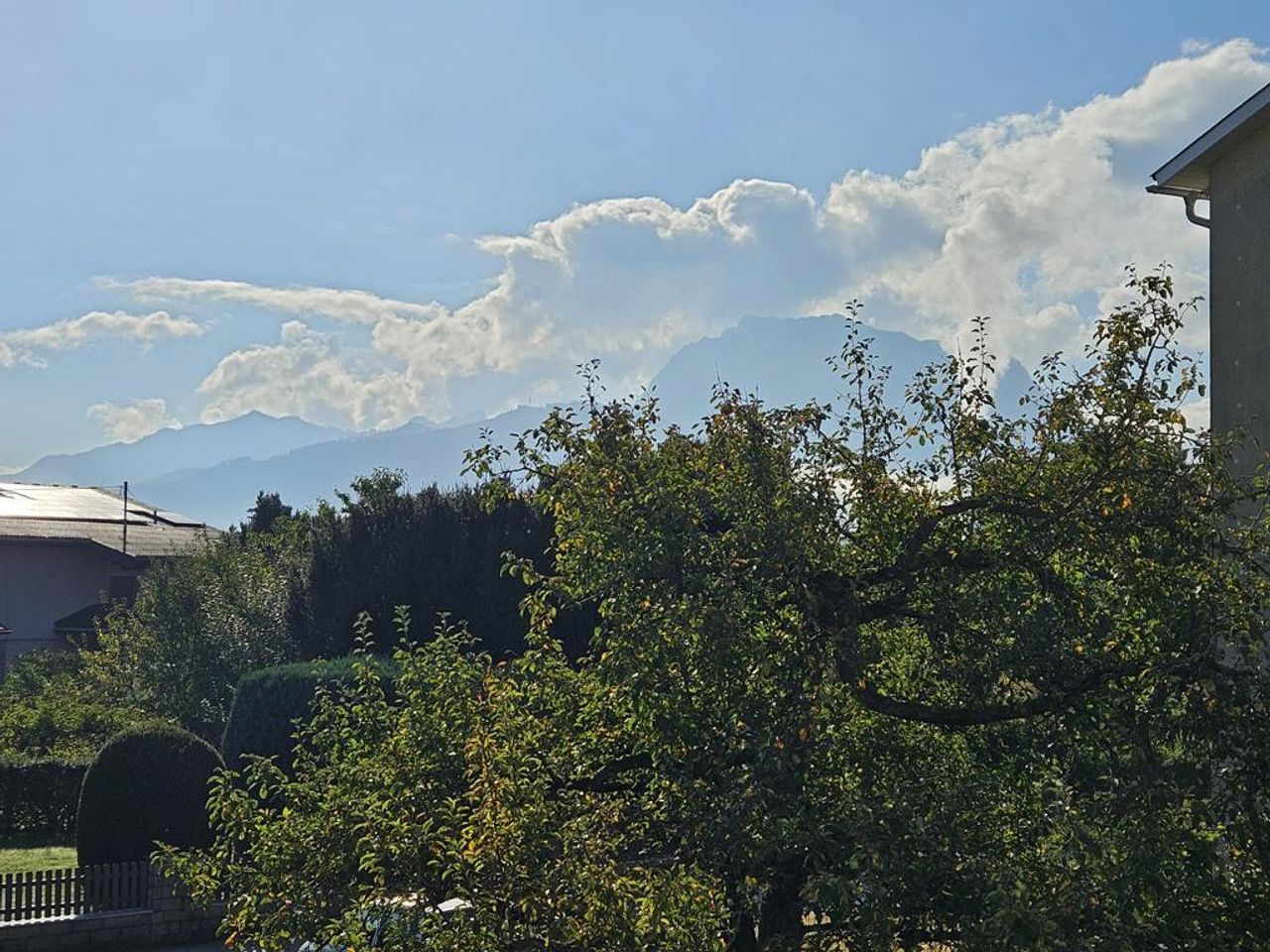 Vom Haus aus ist der Blick auf den Pinsdorfberg gegeben, ebenso besteht vom Balkon Aussicht auf den Traunstein.