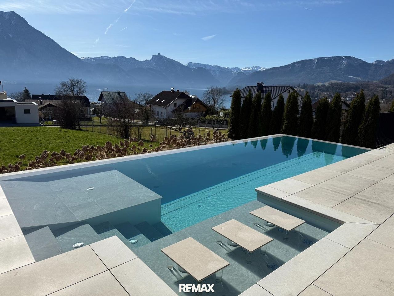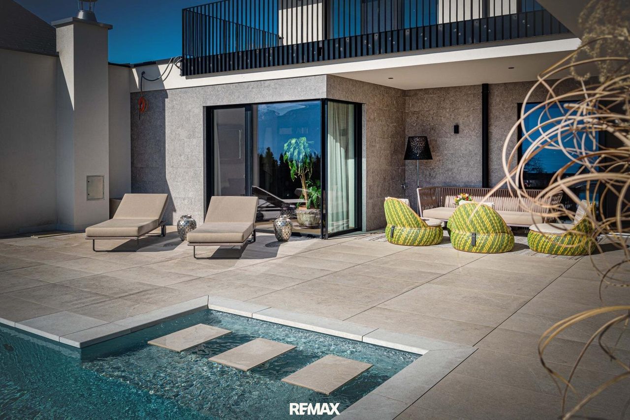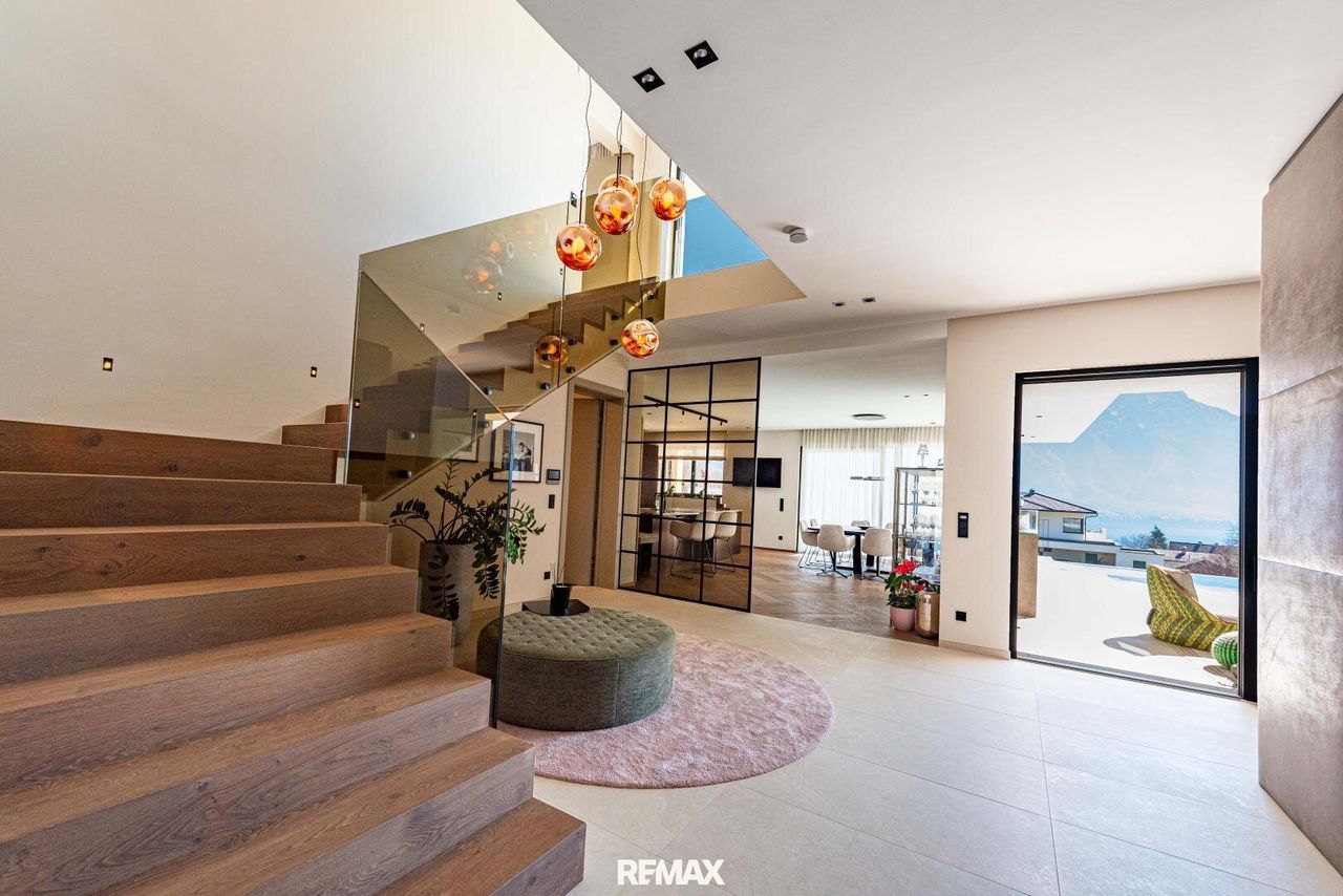 Ein Zuhause der Extraklasse Bereits beim Betreten dieser Liegenschaft spürt man die besondere Atmosphäre. Der großzügige Eingangsbereich führt in das Herz des Hauses: die exklusive Küche, vom italienischen Luxushersteller Poliform, mit hochwertigen Gaggenau-Geräten. Von hier aus öffnet sich der Wohnraum mit großen Fensterfronten, die sich komplett aufschieben lassen und den direkten Zugang zur beeindruckenden Panoramaterrasse ermöglichen. Die Terrasse verfügt über eine stilvolle Lounge, einen überdachten Essbereich sowie einen großzügigen, selbstreinigenden Pool mit atemberaubendem Blick über den Traunsee und die umliegende Gebirgslandschaft.