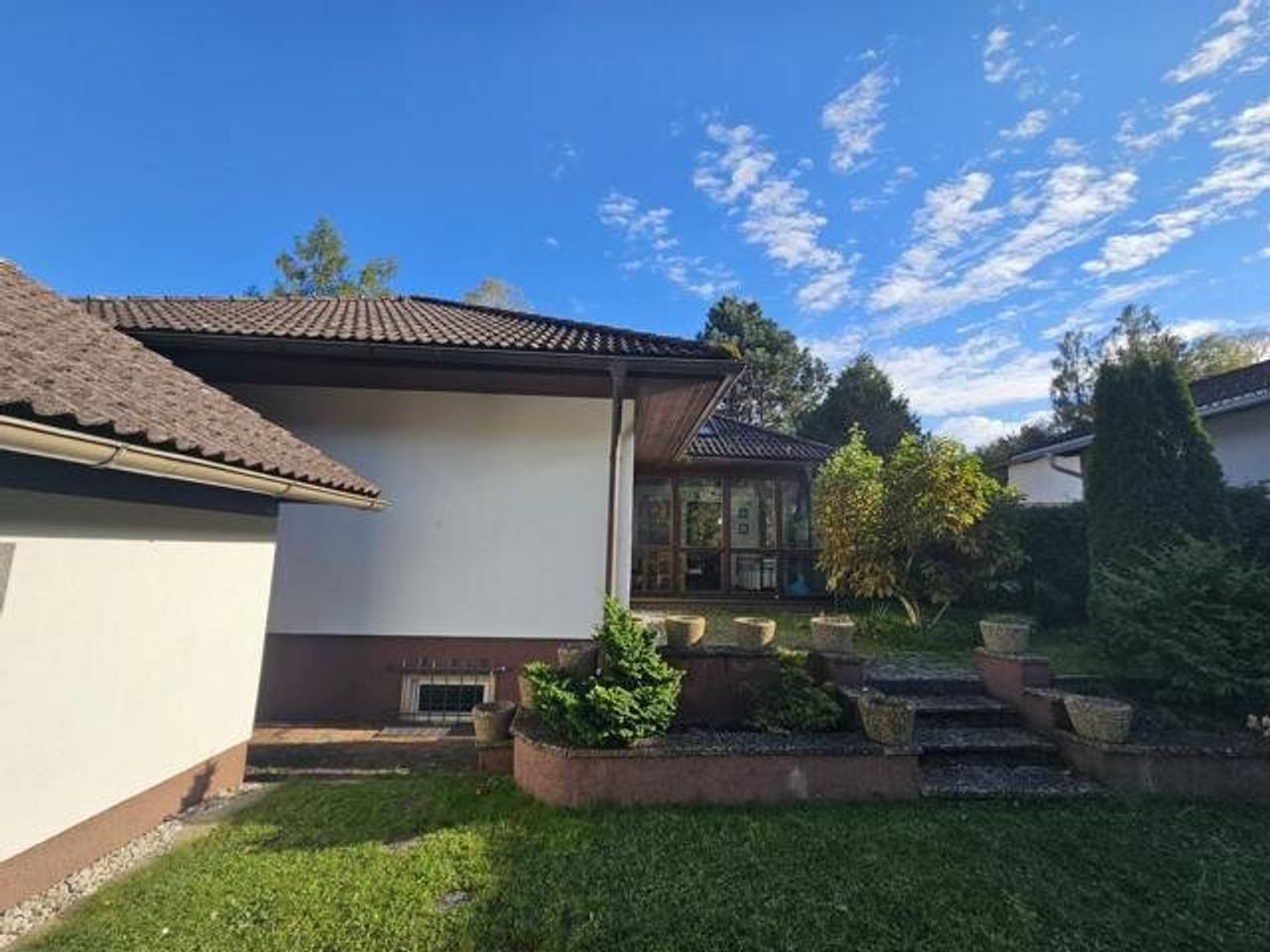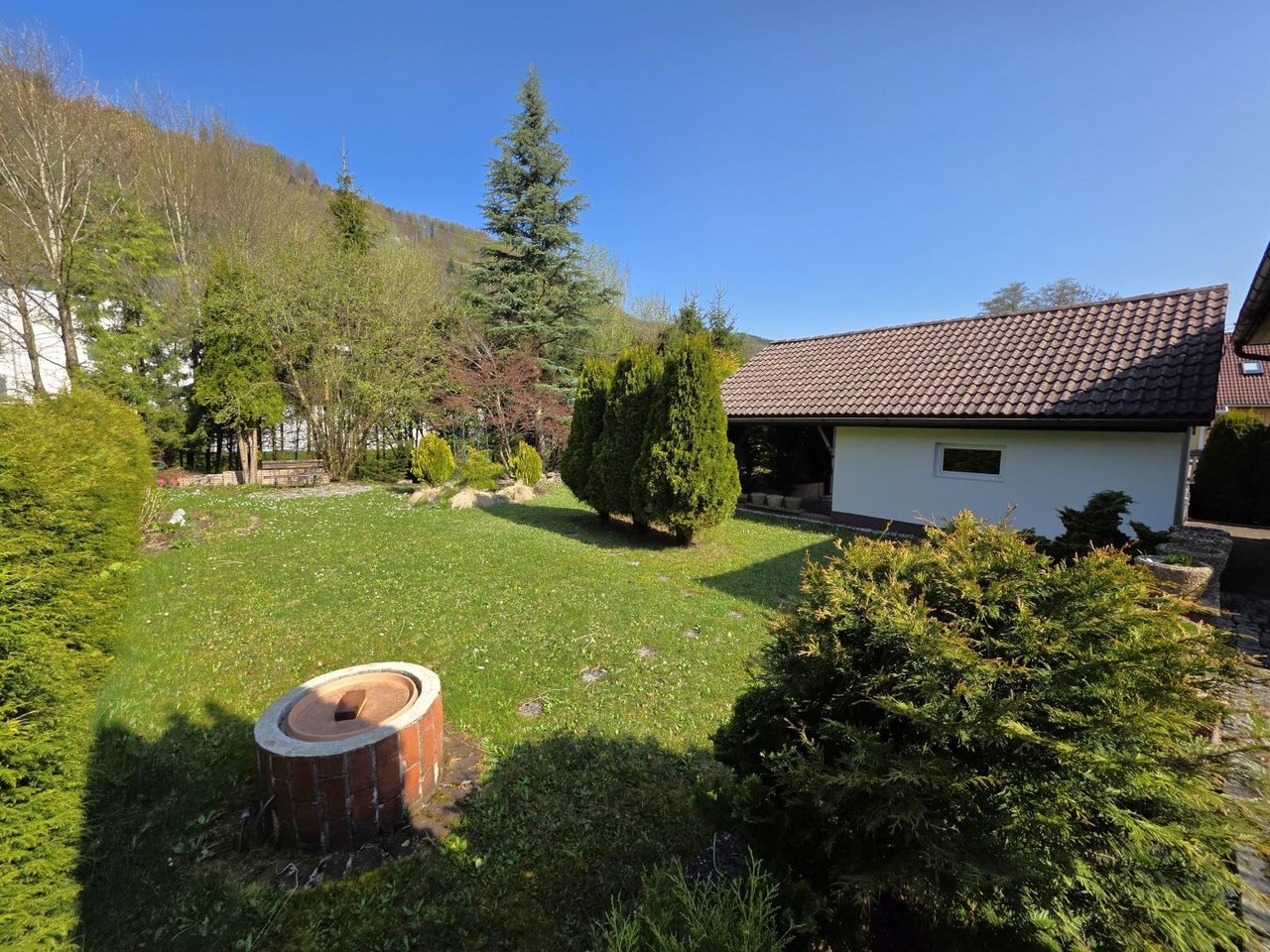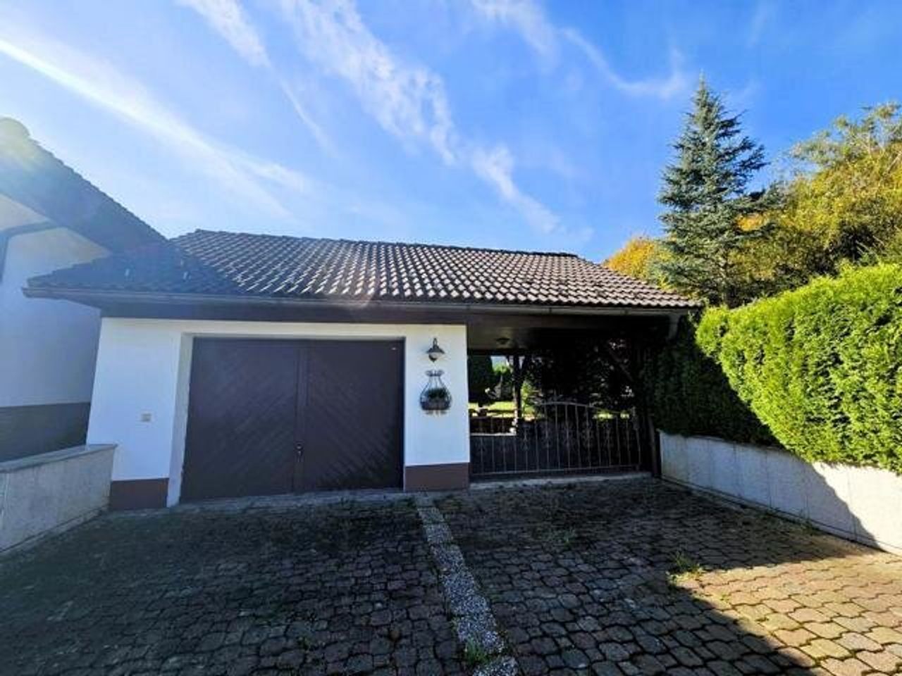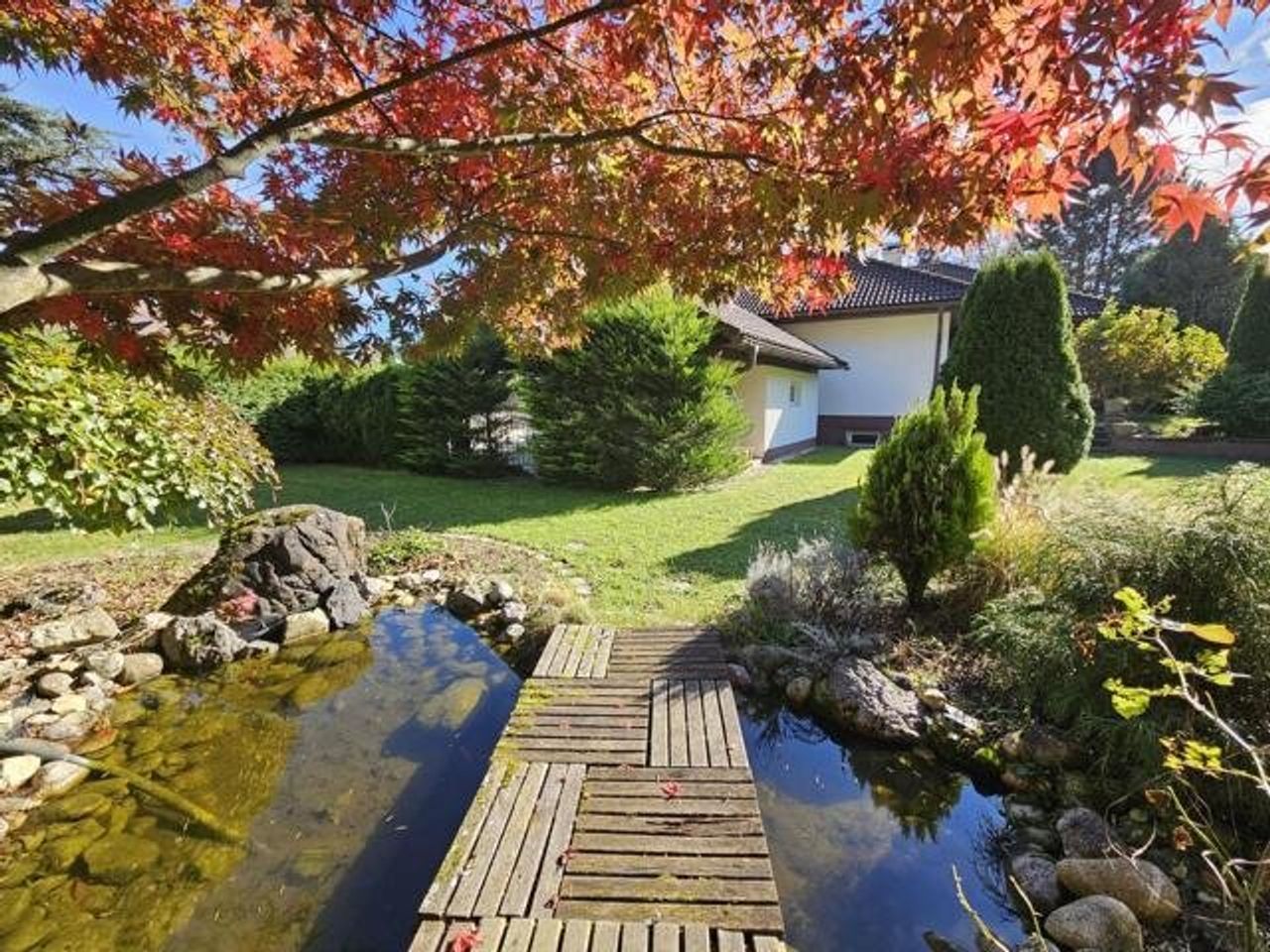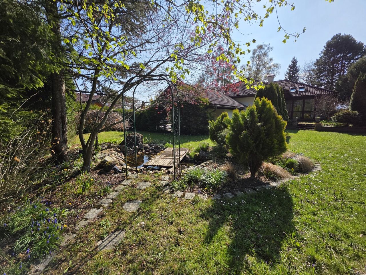 Der idyllische Garten mit einem Biotop lädt zum Verweilen ein und schafft eine erholsame Oase im Freien. Darüber hinaus stehen eine Garage, ein Carport und 2 Stellplätze im Freien zur Verfügung.
